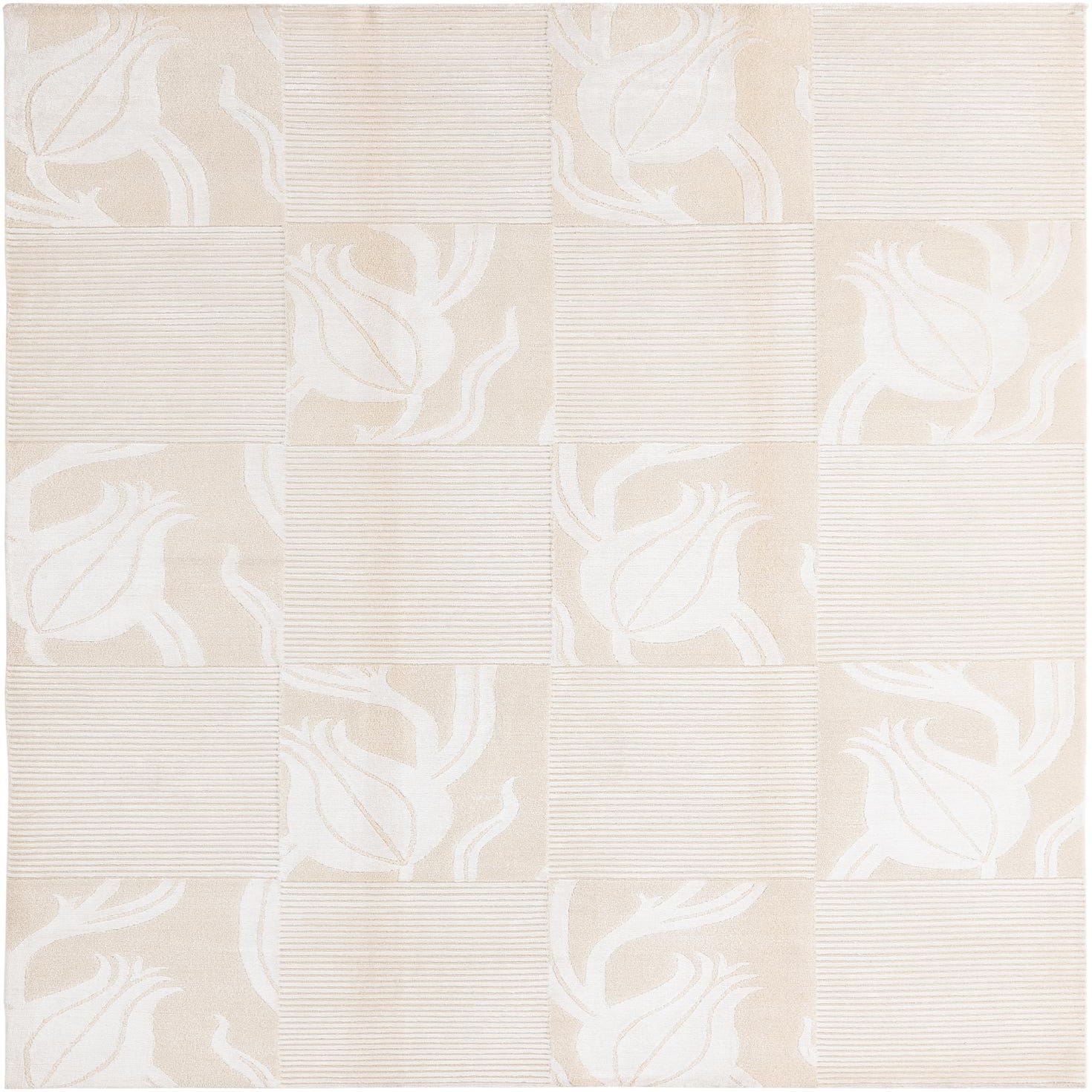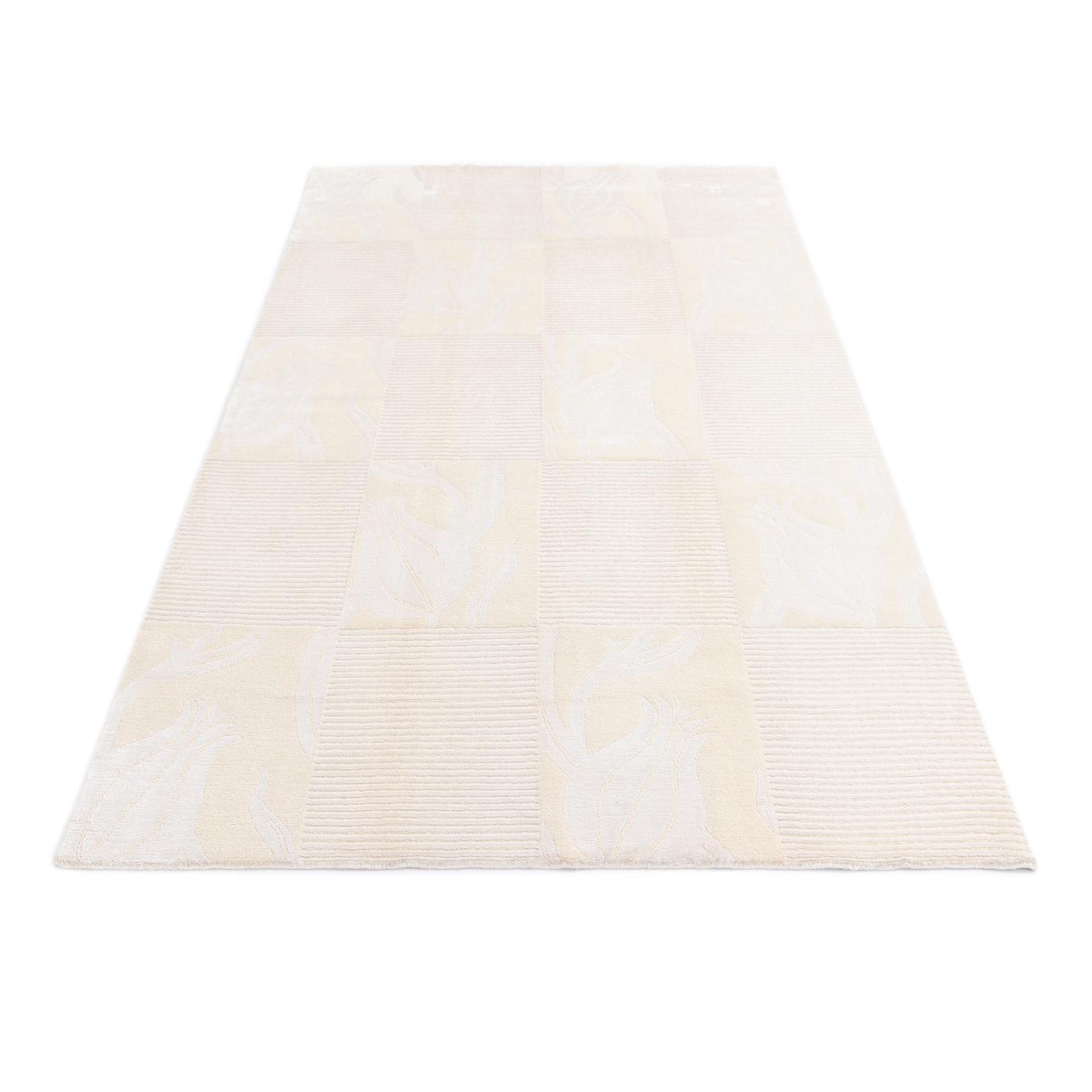 The Darya Collection offers a sophisticated hand-knotted rug in a versatile 5x8 size, crafted from 100% wool. This piece features a contemporary pattern with graceful floral motifs that present an understated elegance in ivory on a warm beige background. The juxtaposition of the organically shaped floral designs against the structured geometric square segments creates a harmonious balance of form. The textural contrast within the pattern adds a tactile dimension to the rug, enhancing its visual interest and appeal.
