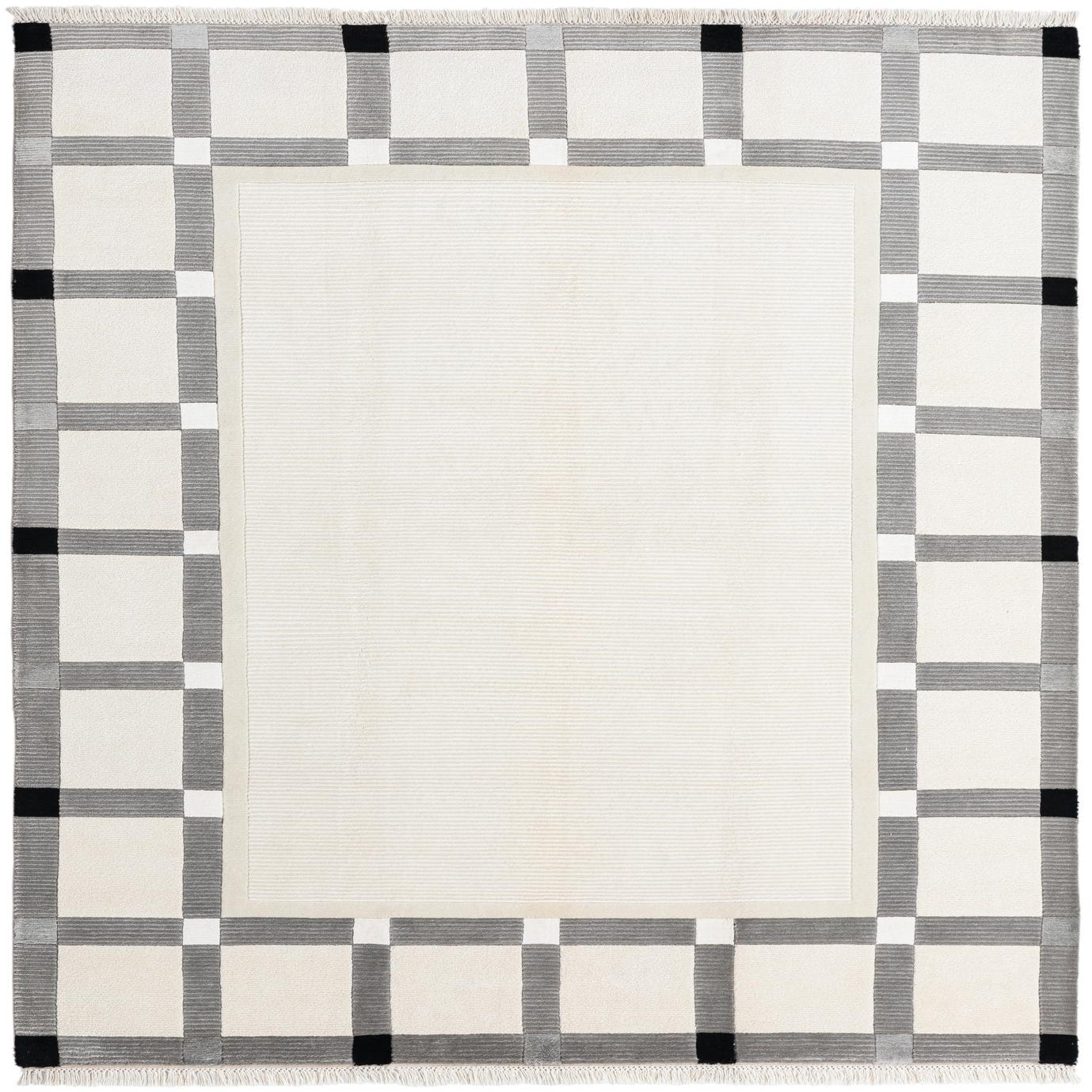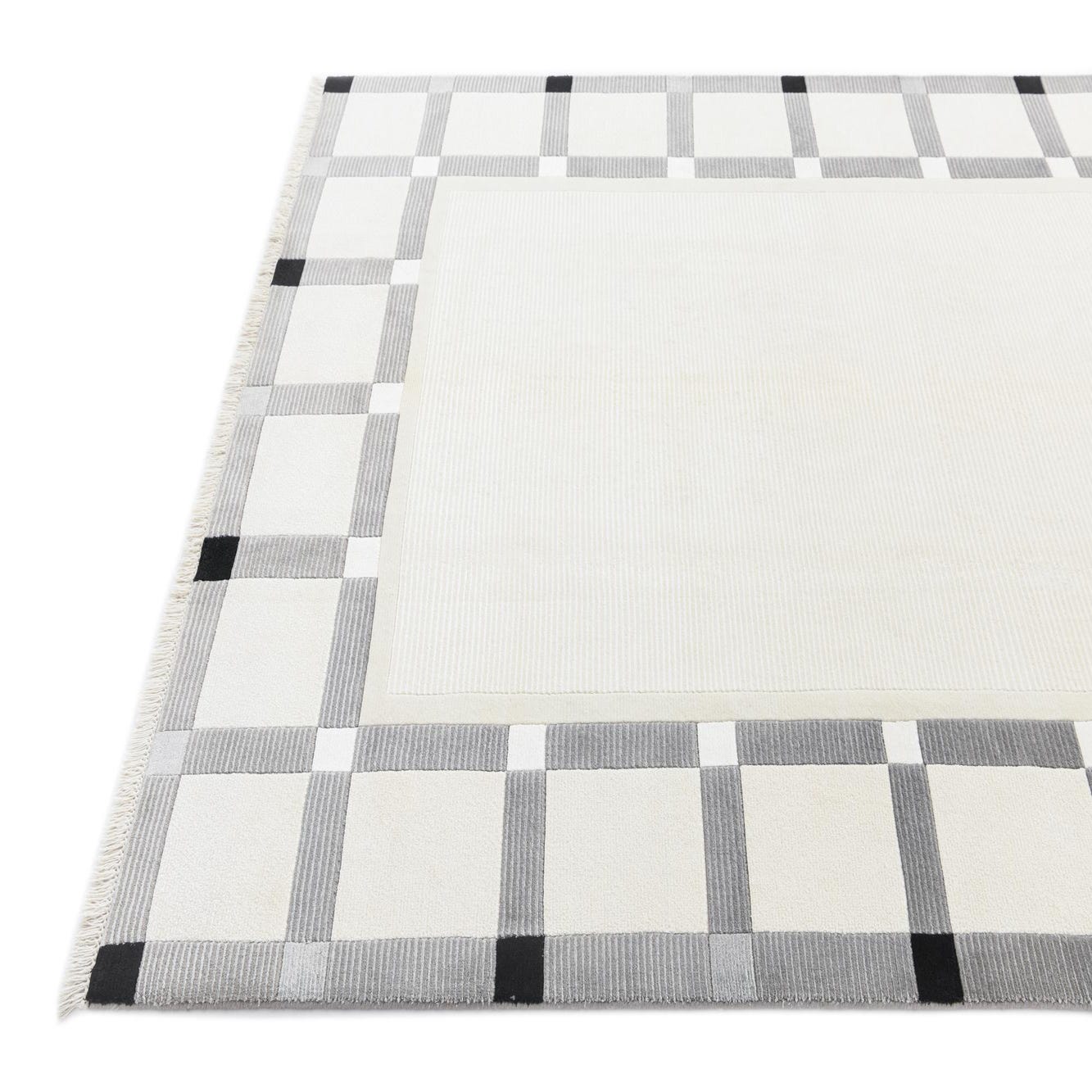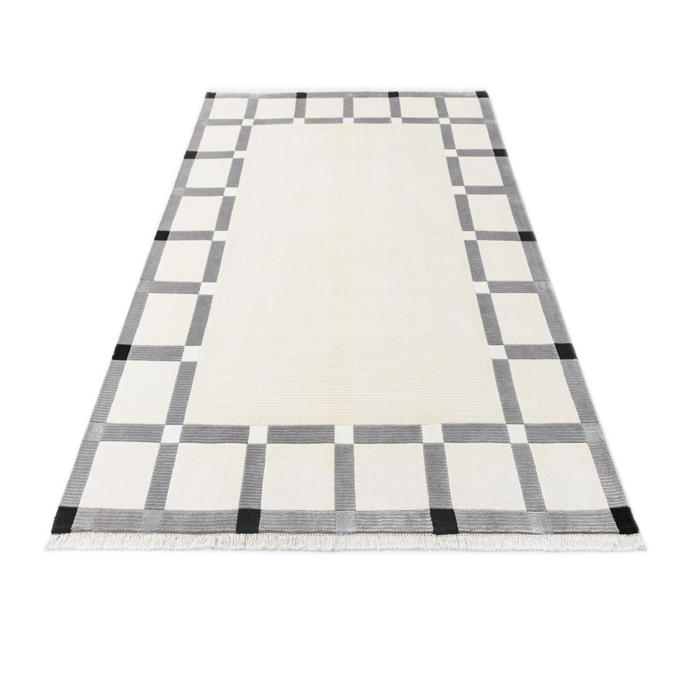 The design showcases clean lines and varying block sizes that create an elegant frame around a solid beige center. The crisp edges of the pattern against the neutral background provide visual interest without overwhelming a space. The subtle fringe detailing adds a touch of traditional craftsmanship, bridging the gap between modern design and timeless technique.