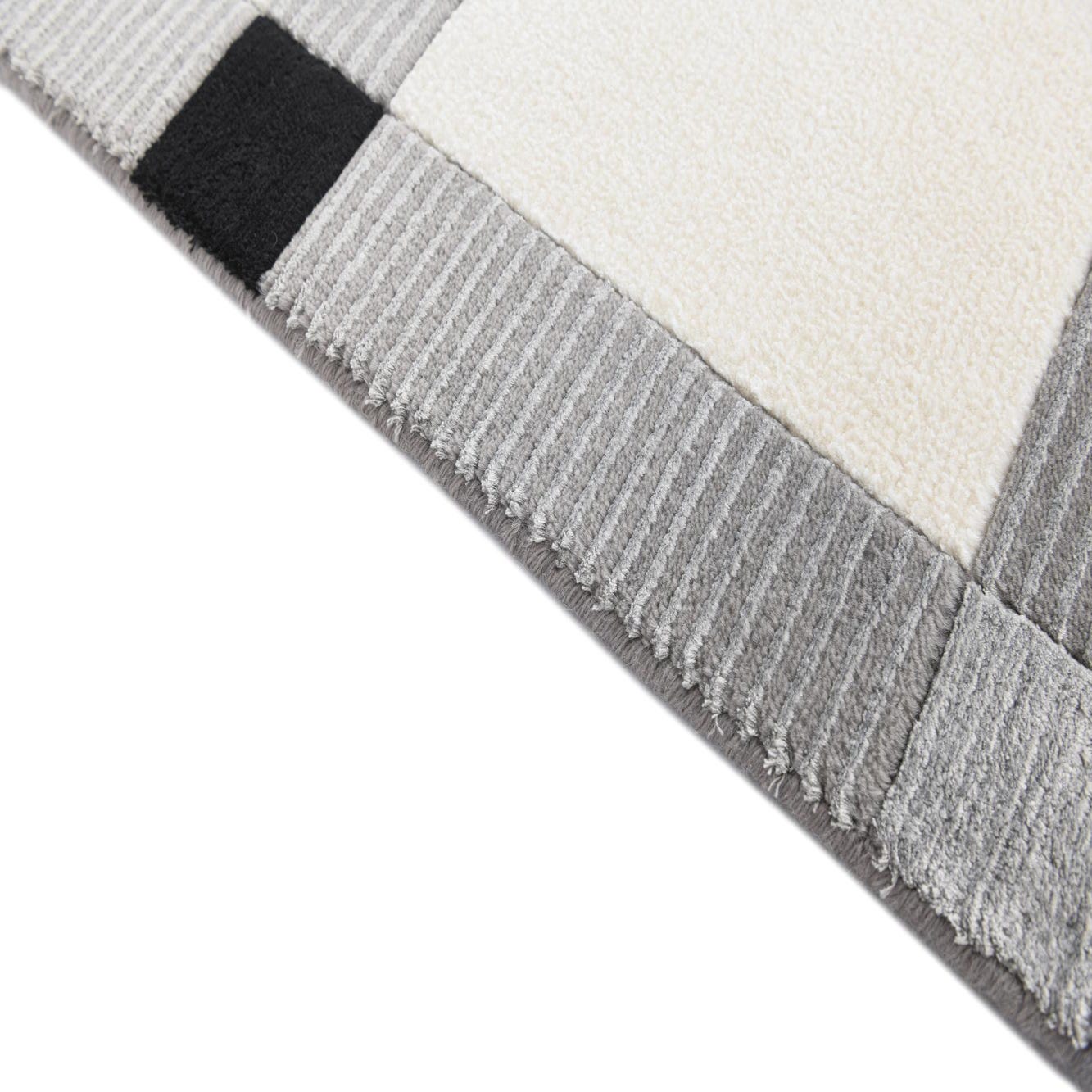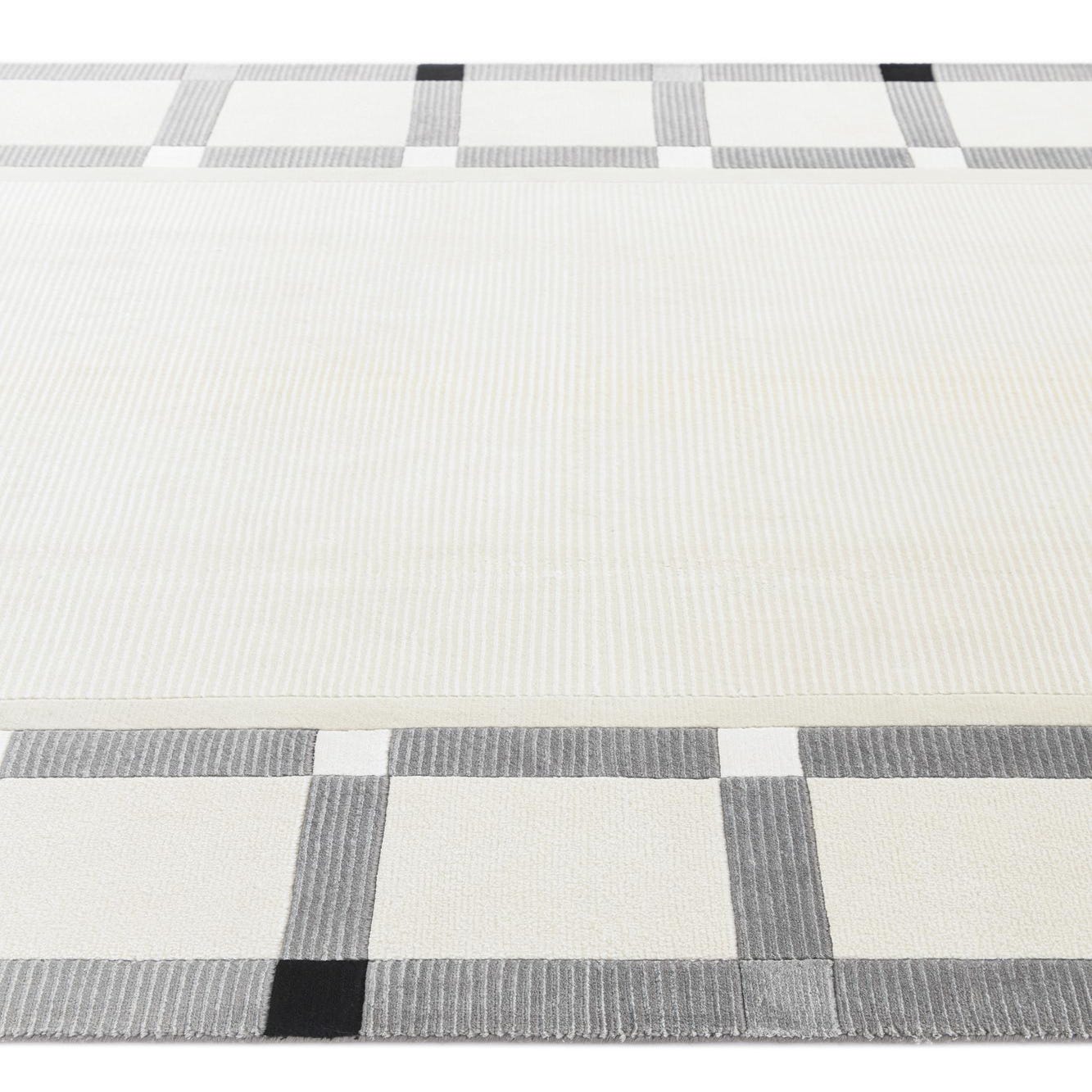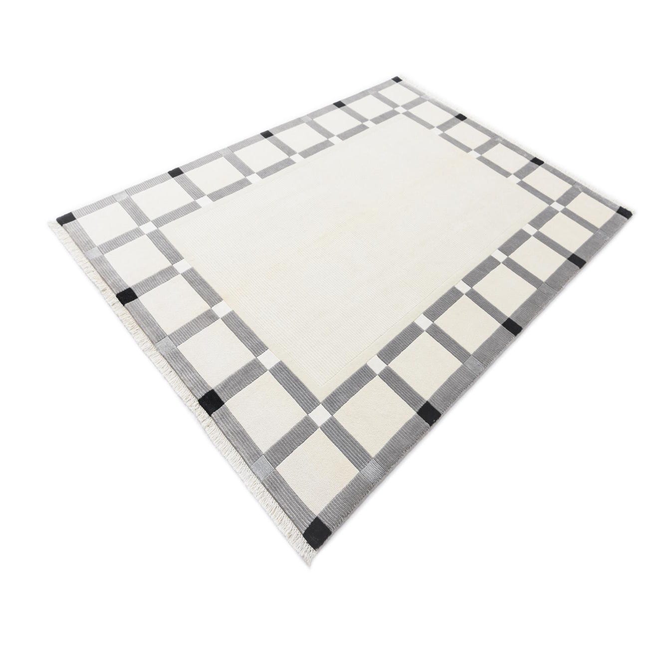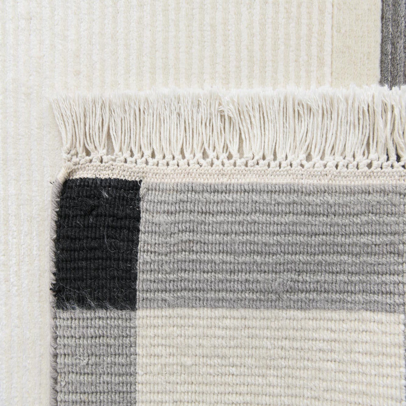The design showcases clean lines and varying block sizes that create an elegant frame around a solid beige center. The crisp edges of the pattern against the neutral background provide visual interest without overwhelming a space. The subtle fringe detailing adds a touch of traditional craftsmanship, bridging the gap between modern design and timeless technique.
