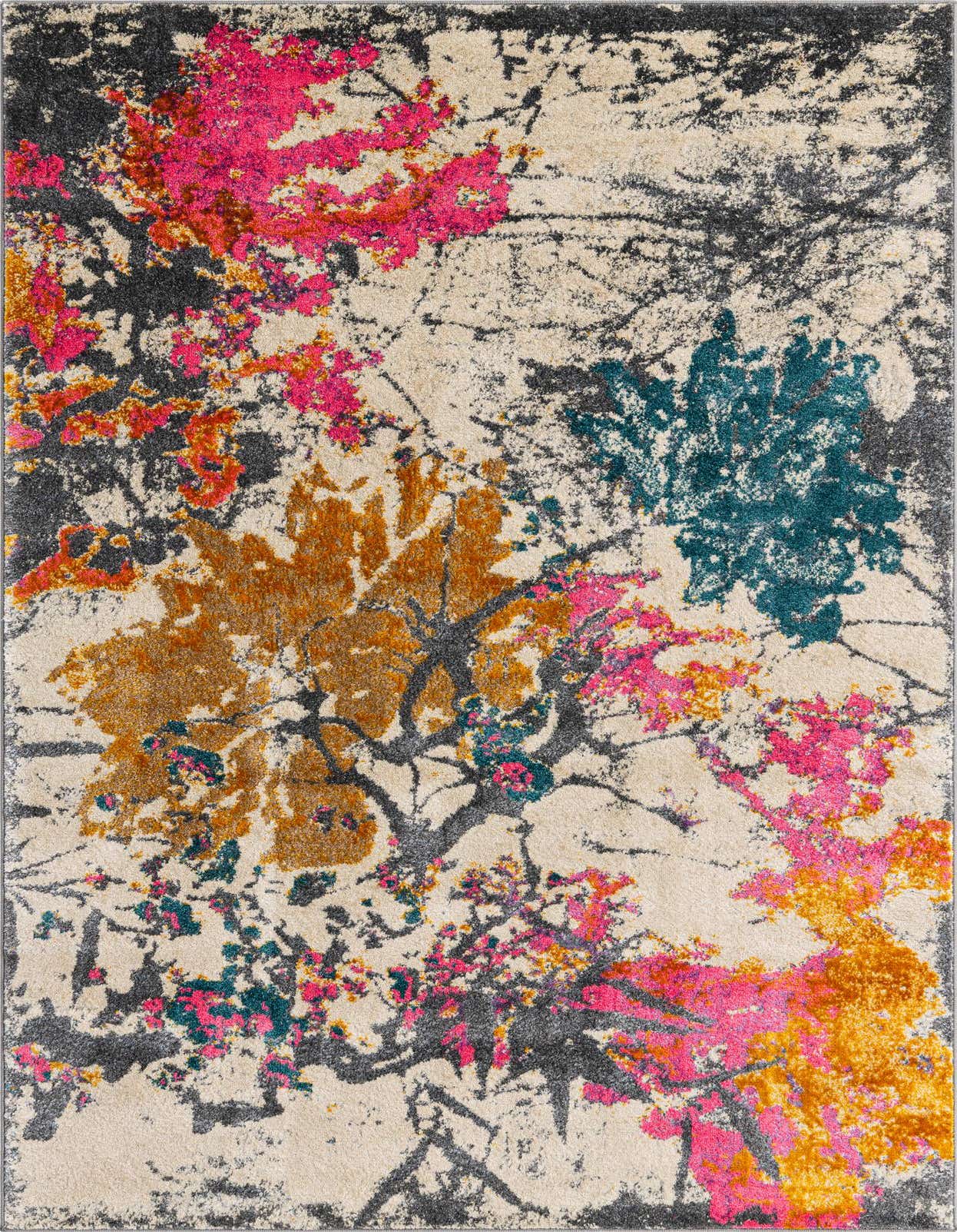Primary color is Beige. Colors in this rug include: Beige, Blue, Gold, Gray, Ivory, Orange, Yellow, Pink.