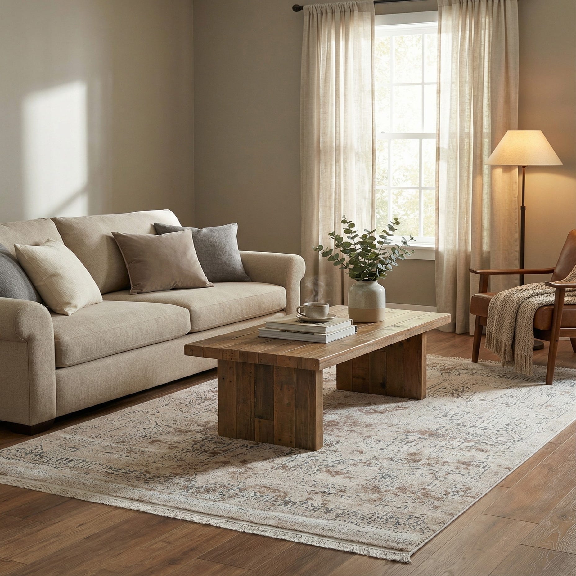 Primary color is Beige. Colors in this rug include: Beige, Light Brown, Navy Blue, Ivory.