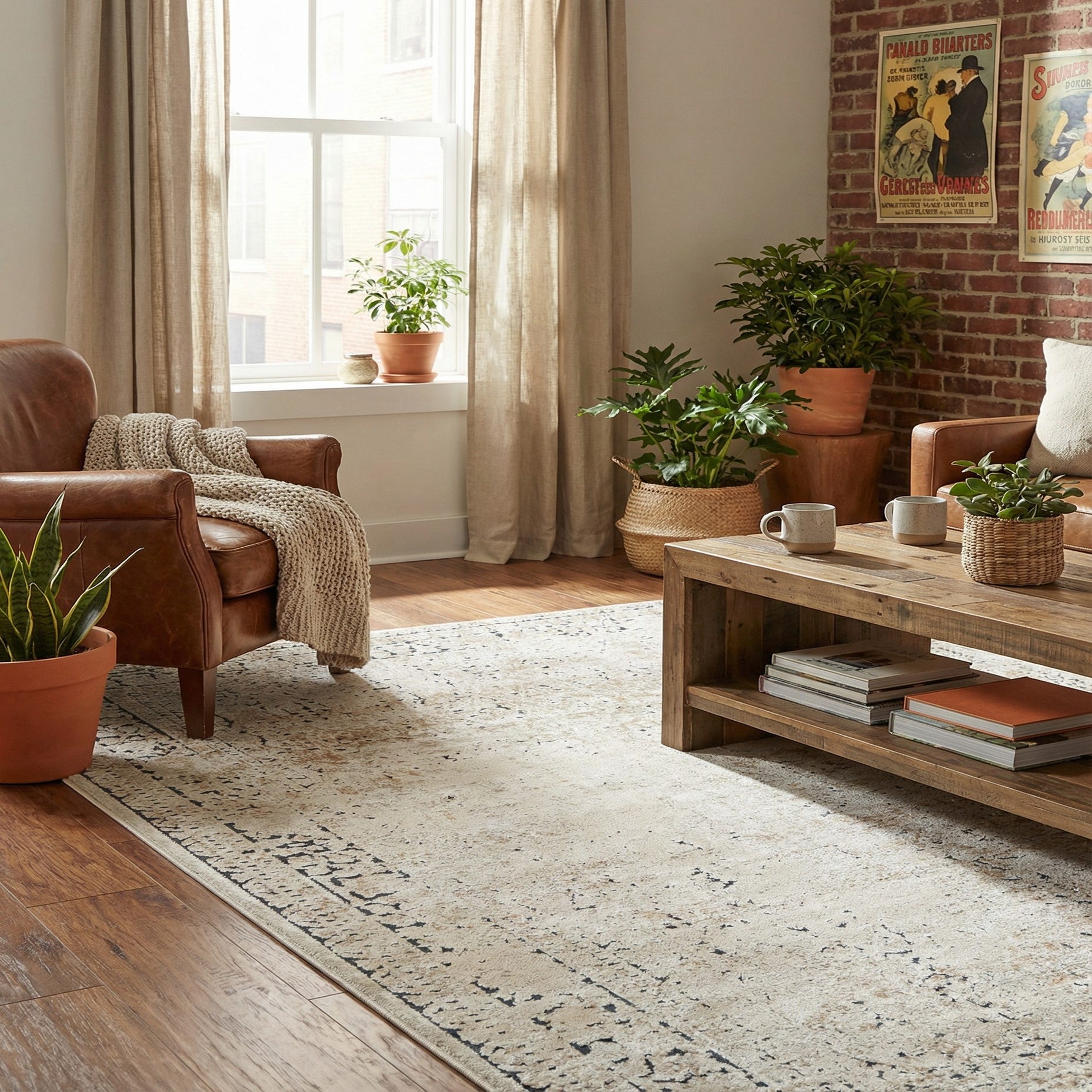 Machine made from 85% polypropylene and 15% chenille, this rug combines polypropylene’s durability with chenille’s soft, velvety texture for a comfortable underfoot feel and a low-profile pile that sits nicely under furniture. The neutral palette and relaxed pattern work well in a casual living room beneath a coffee table, in a dining area with natural wood furnishings, or layered under a bed to add warmth and quiet pattern without overwhelming the space.