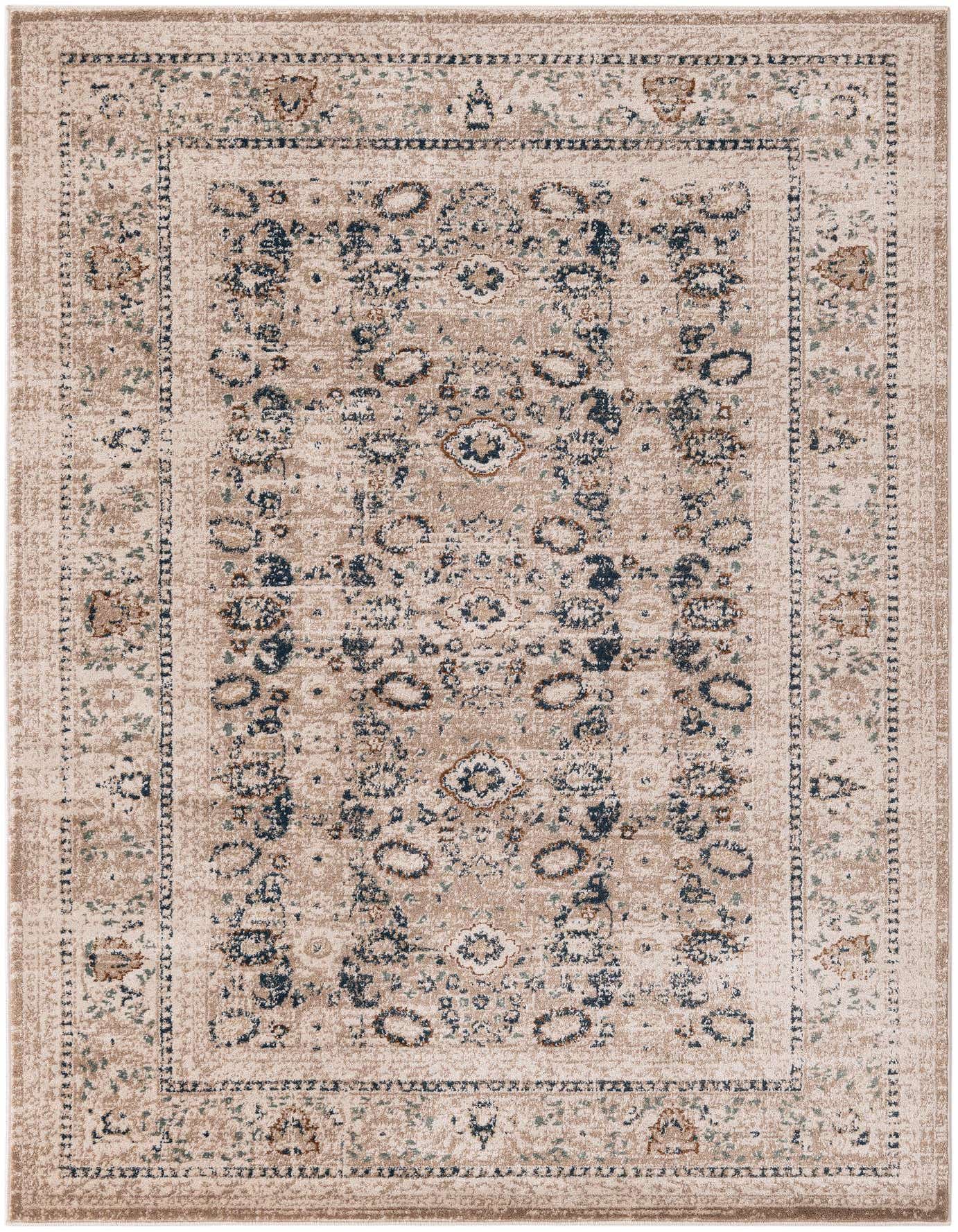 Primary color is Beige. Colors in this rug include: Beige, Brown, Light Blue, Navy Blue.