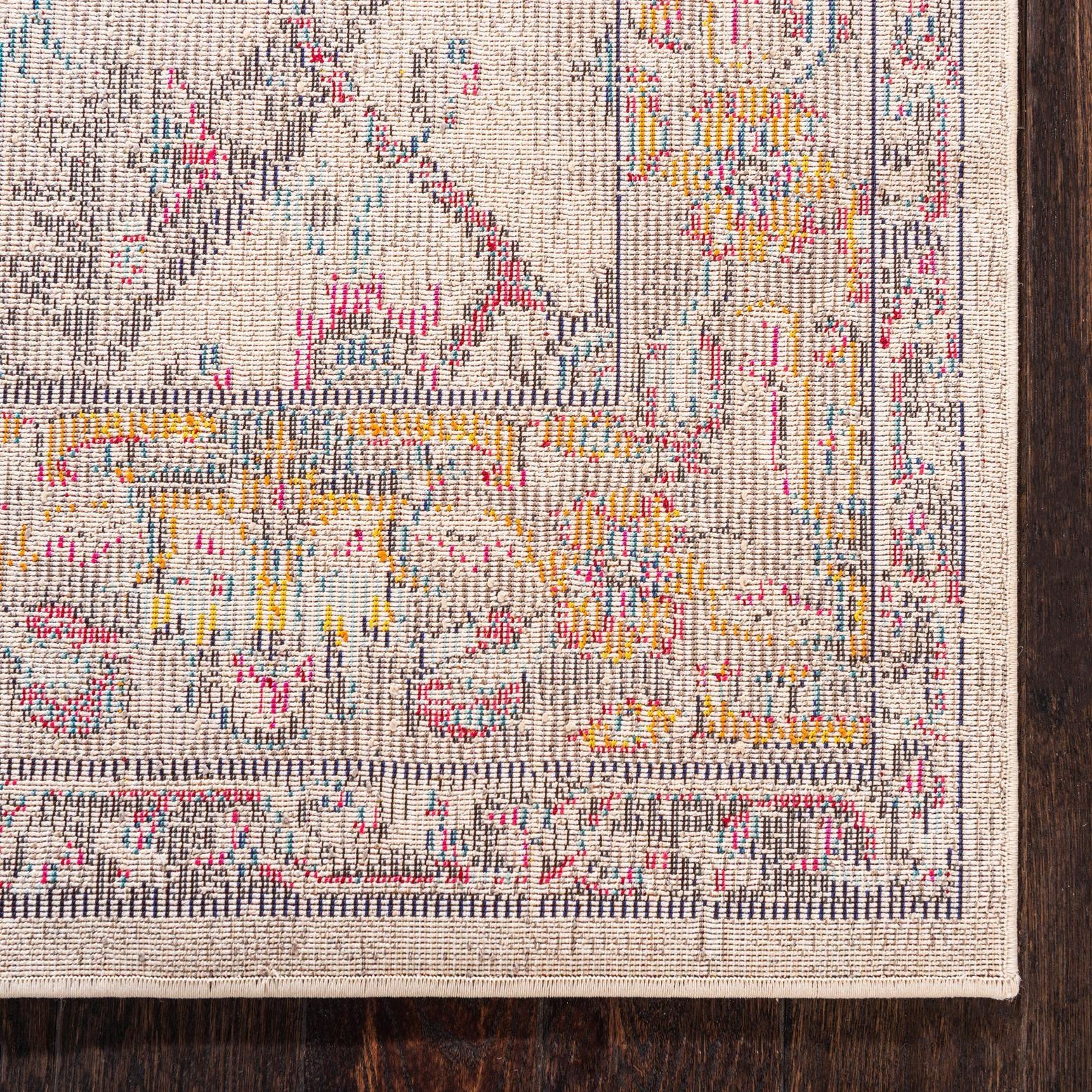Primary color is Beige. Colors in this rug include: Beige, Blue, Pink, Brown, Gold, Gray, Orange.