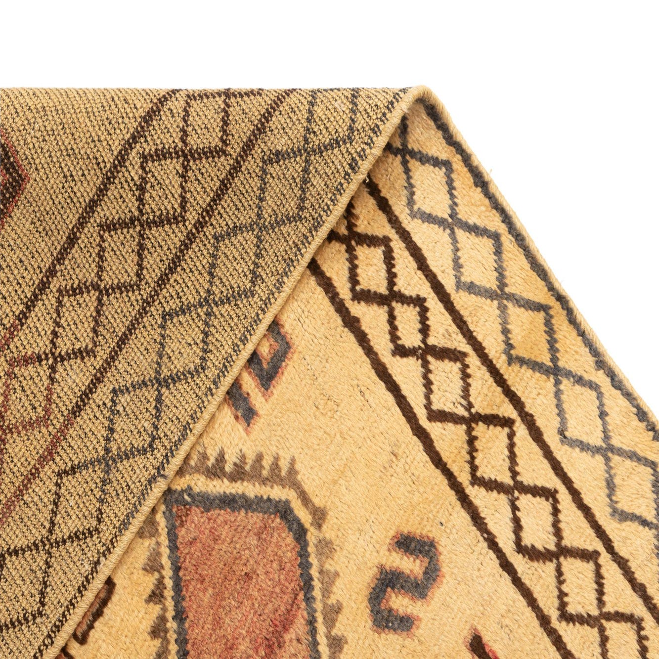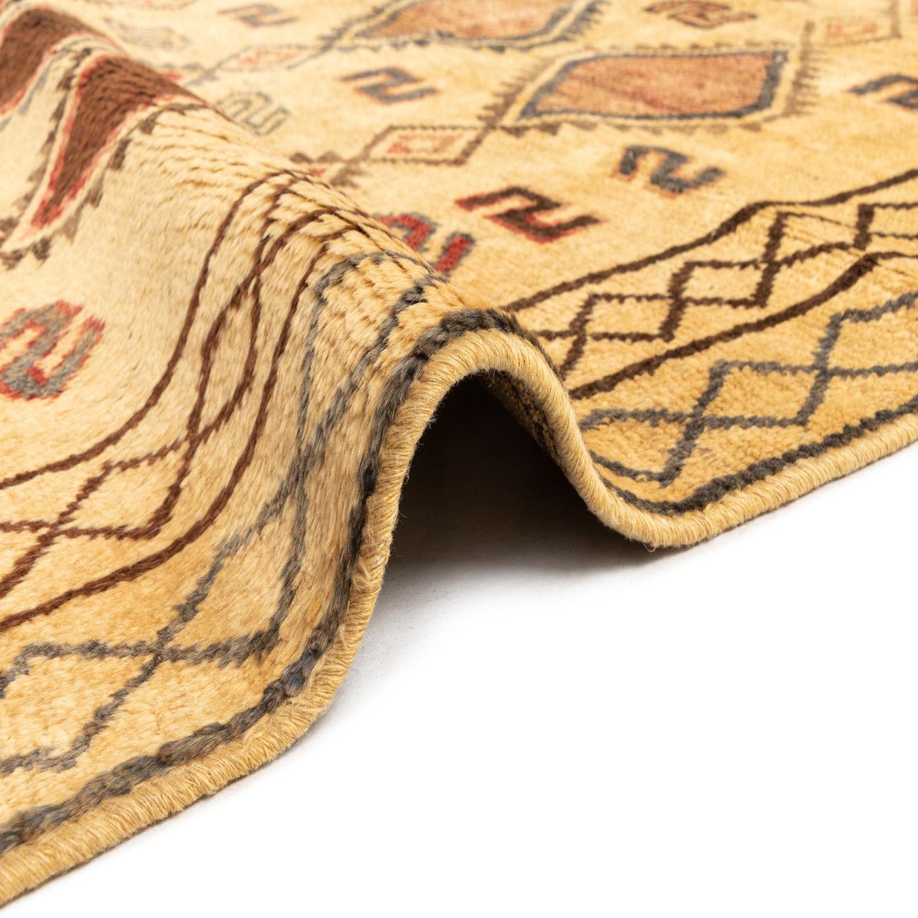 Crafted from 100% wool, the rug offers a robust texture that is warm and inviting. Its hand-made nature ensures each piece is unique, with slight variations that add character to its rustic, tribal aesthetic.