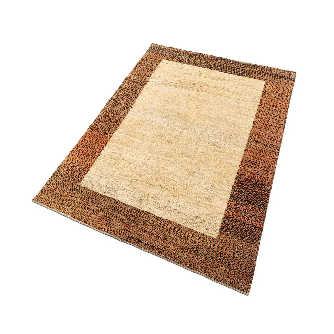 A 5x8 rectangular Gabbeh Shouli rug with a cream center and a wide textured brown and black modern border.