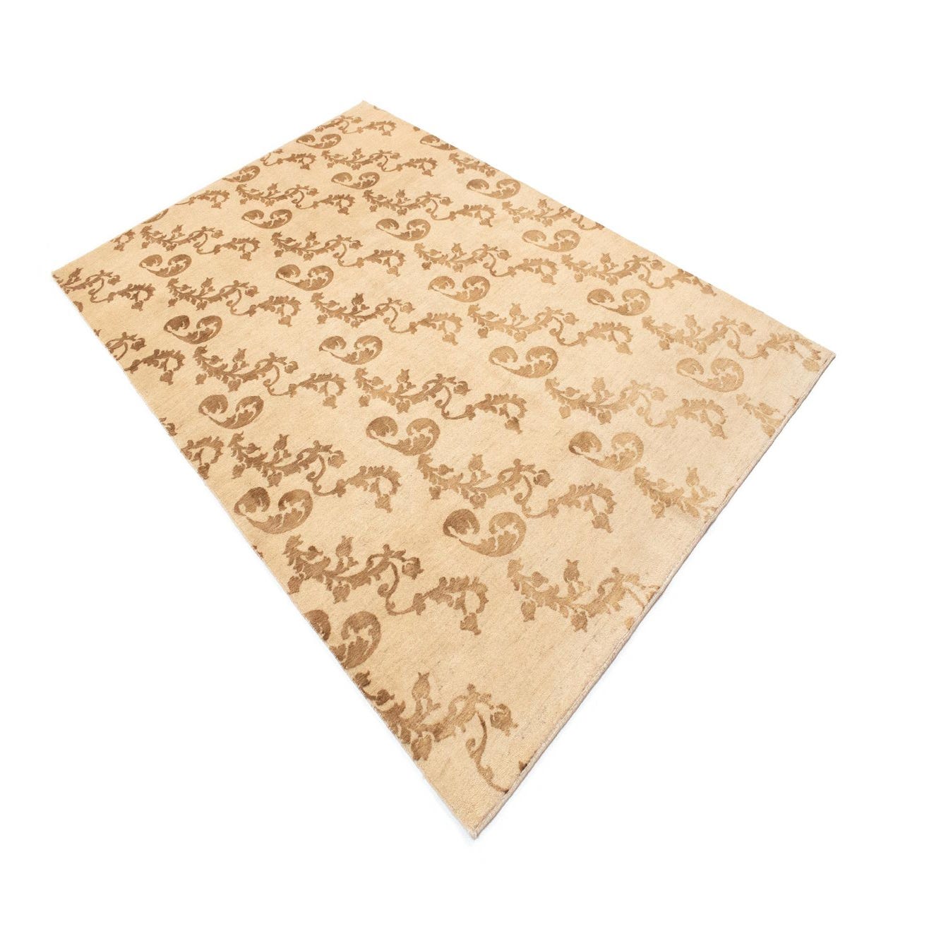 A 5x8 rectangular Isfahan rug featuring a repeating floral and paisley pattern in shades of brown and tan on a cream background.
