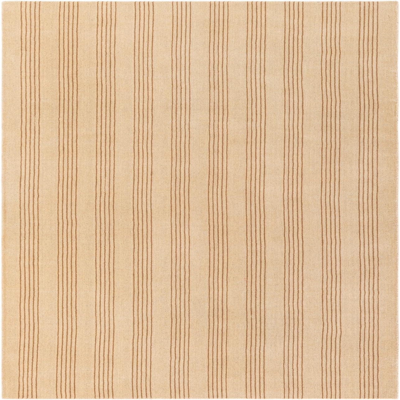 A clean, linear stripe pattern in light brown runs vertically across a warm beige field, giving the rug a calm, ordered look that’s easy to live with. The surface is handmade from 80% wool and 20% cotton, offering a soft, tactile pile with a subtle raised feel where the stripes are worked into the ground. The low-profile texture is pleasant underfoot and the natural wool tone of the background keeps the overall effect restrained and approachable.