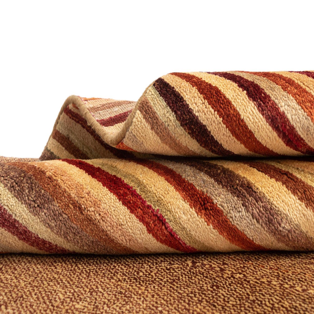 A 5x8 rectangular Juma Persian rug featuring a central stripe pattern in browns, tans, and ivories, flanked by solid tan wool sections.