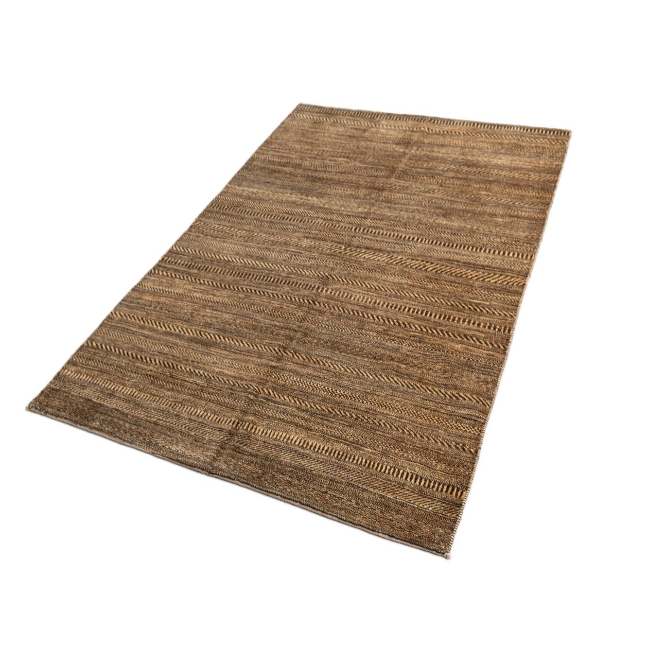 A 5x8 rectangular Juma Persian rug in varying shades of brown and tan with intricate horizontal patterns.