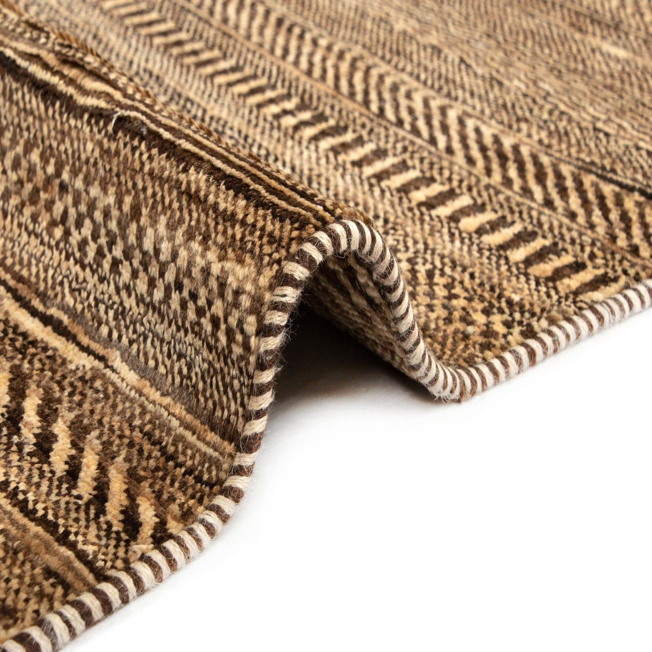 The Juma Collection offers a 5x8 hand-made rug crafted from 100% wool, providing a natural, enduring addition to any living space. This rug features a harmonious blend of beige tones, complemented by variegated brown and cream stripes that create a subtle yet engaging pattern. The texture of the wool contributes to the tactile experience, adding warmth and comfort underfoot.