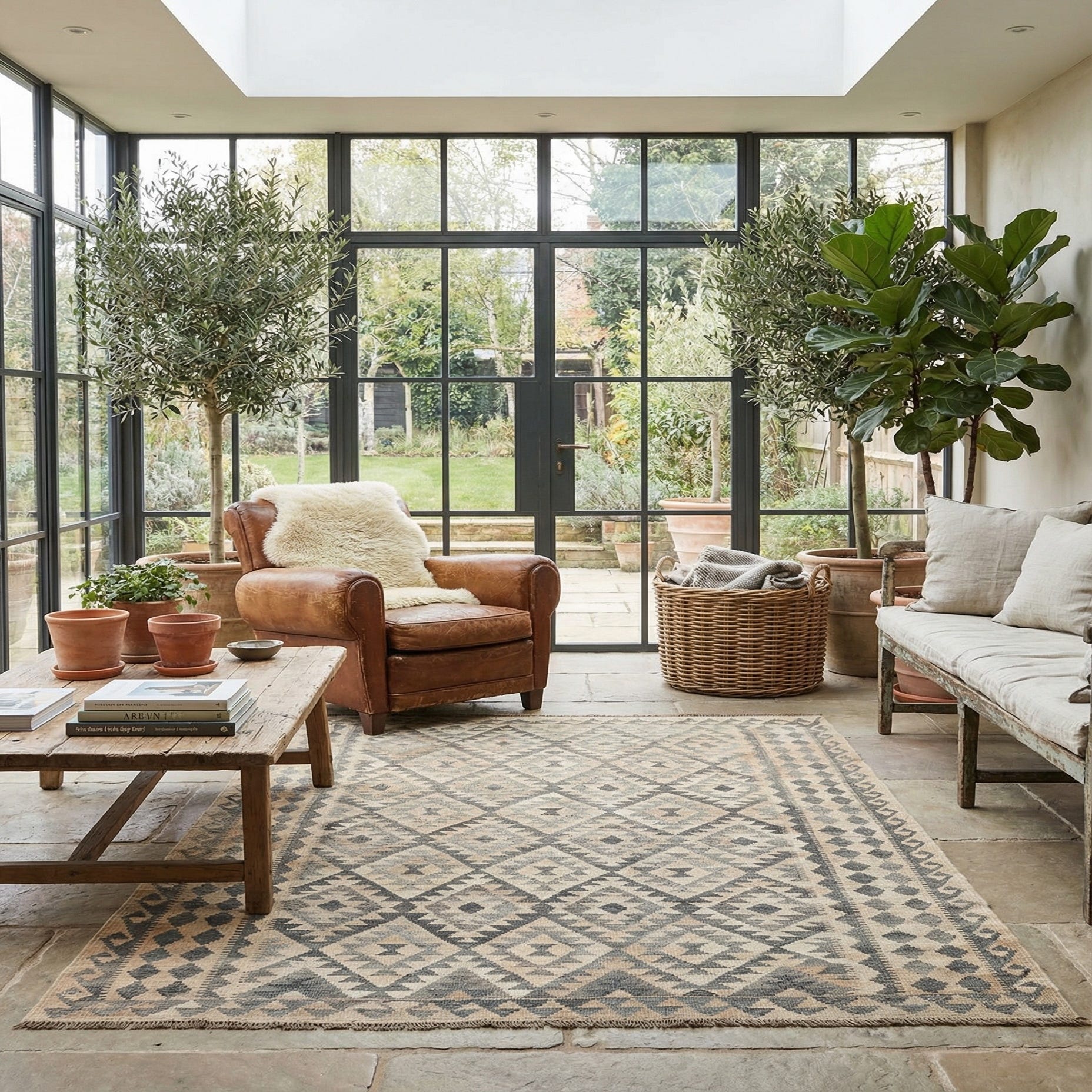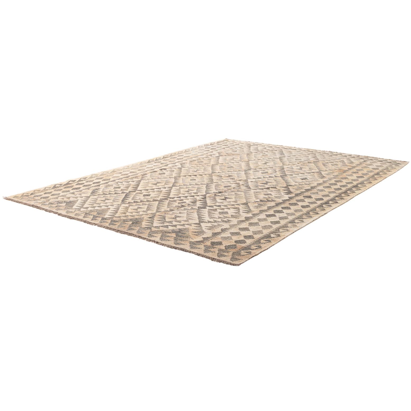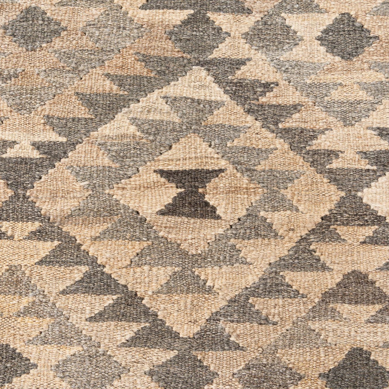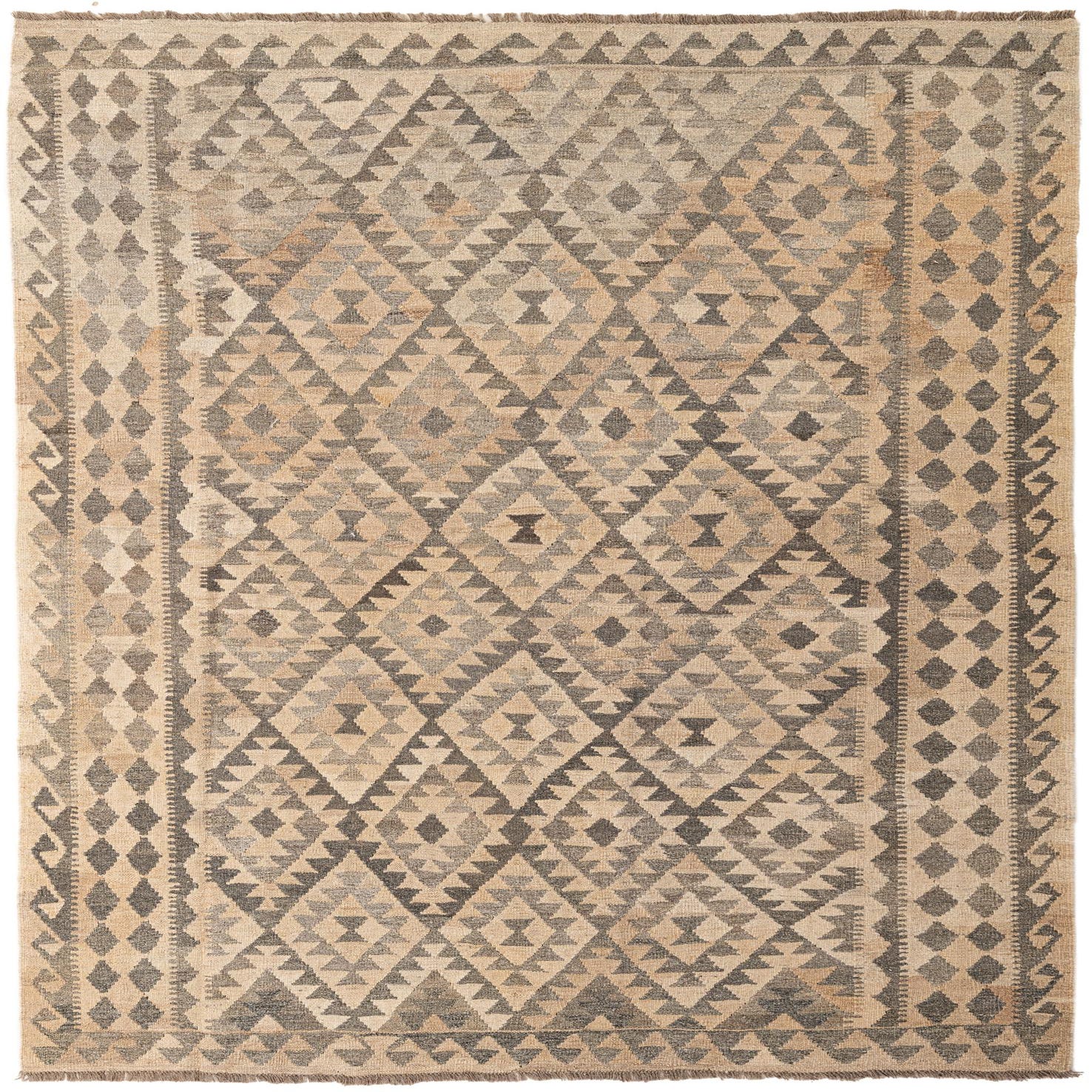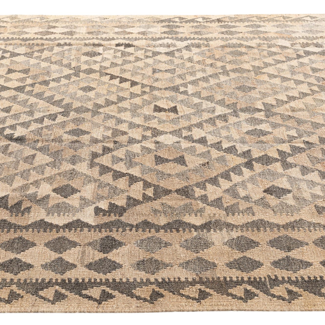 A 5x8 rectangular Kilim Maymana wool rug featuring a tribal geometric pattern in shades of brown, tan, and cream.