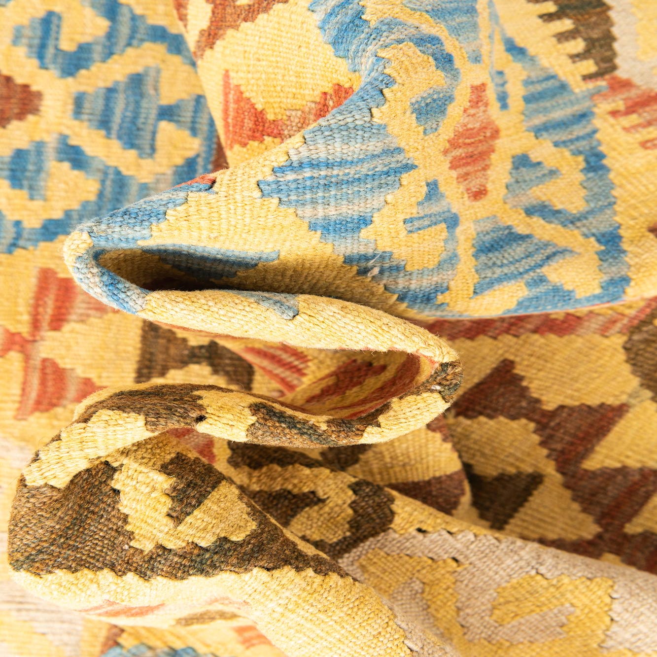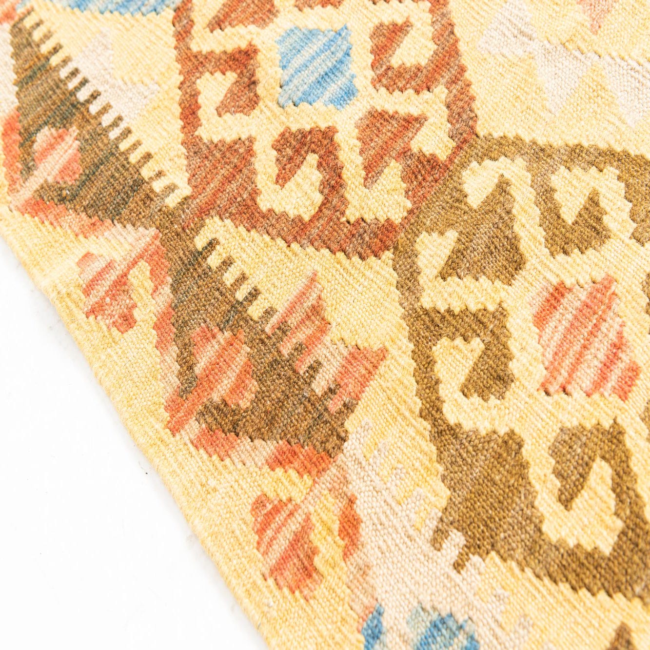 In terms of interior design, this rug would complement a variety of scenarios. It would sit beautifully in an eclectic setting that appreciates a mix of cultural influences, or it could serve as a statement piece in a more minimalist space, where its intricate pattern and vibrant colors would stand out against a subdued decor. This Kilim Maymana rug would also work well in a contemporary environment that leans towards clean lines and sleek finishes, providing a touch of texture and warmth.