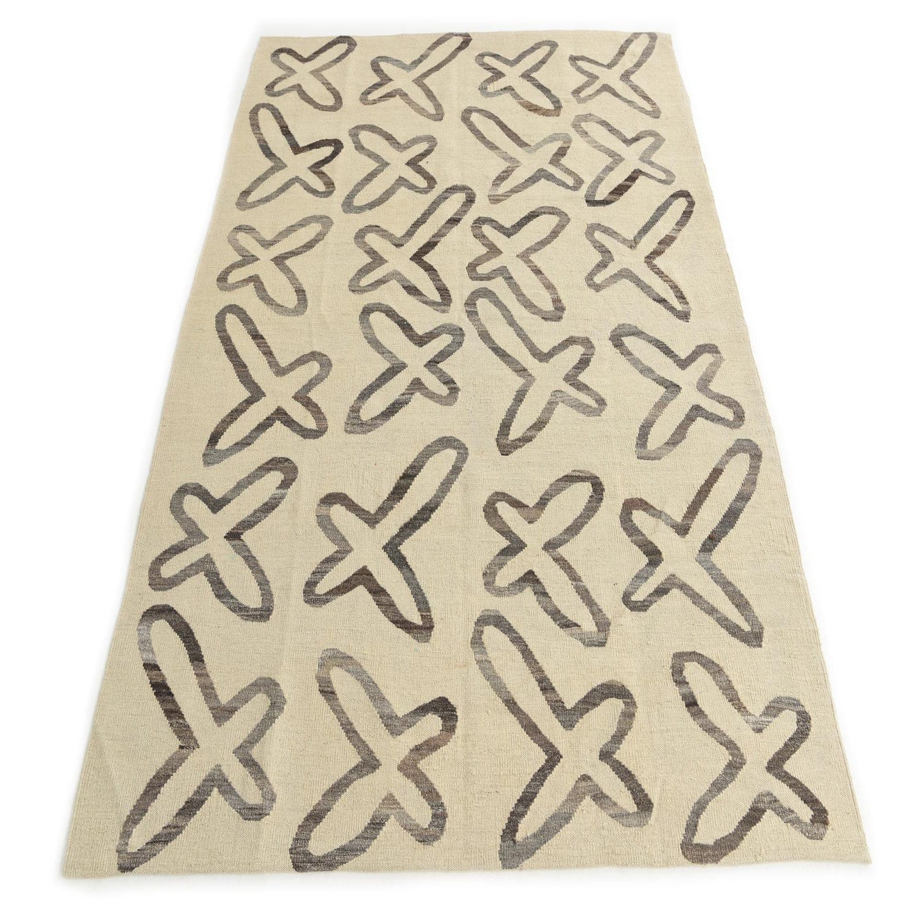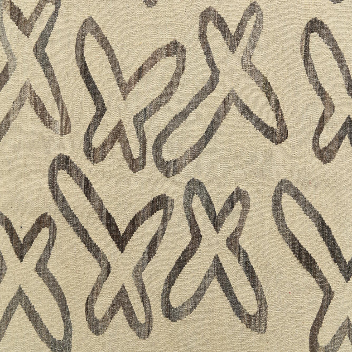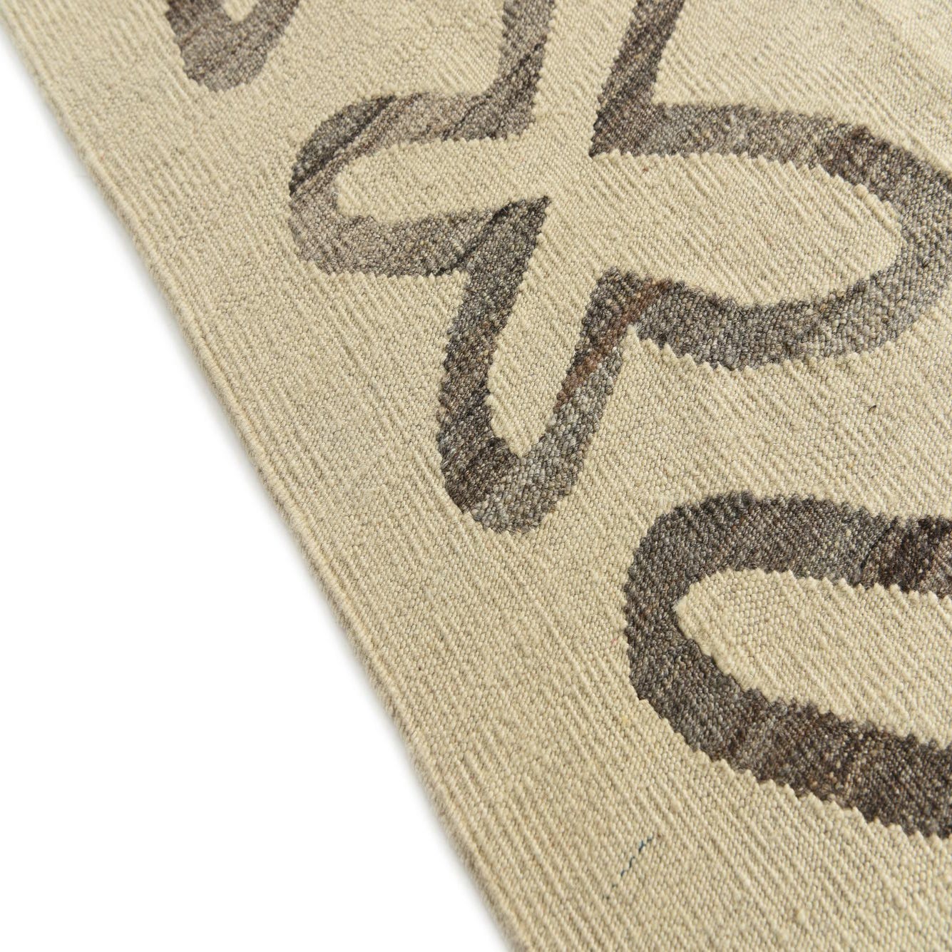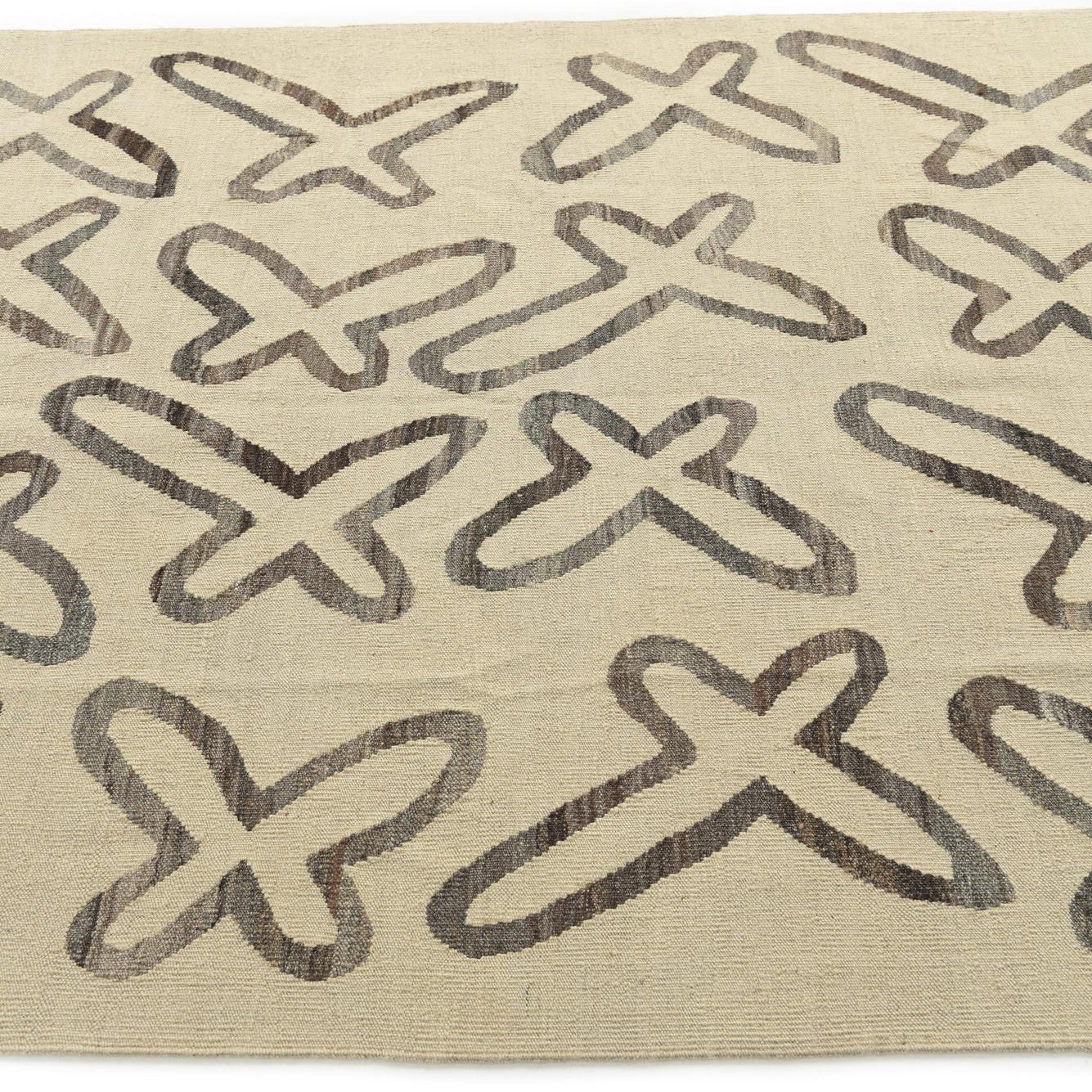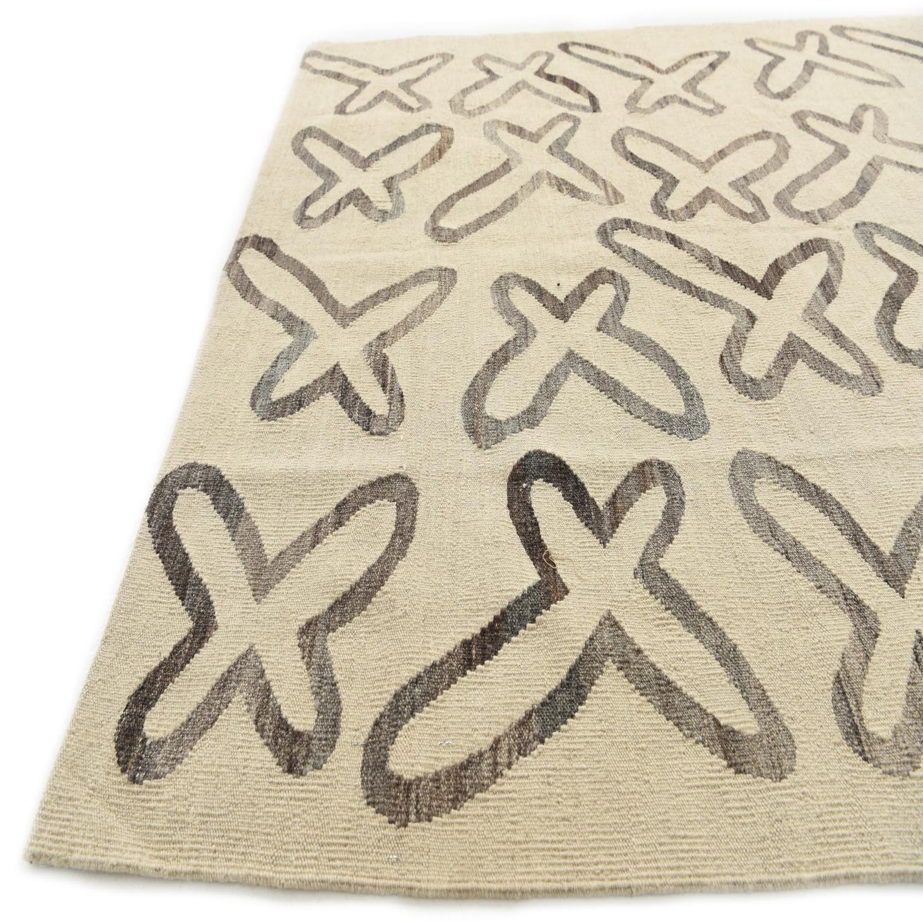 Part of the Kilim Modern collection, this hand-woven rug is crafted from 100% wool, offering a durable and textured quality. Measuring 5x8 feet, this area rug features a contemporary take on traditional kilim designs, highlighted by a beige backdrop with an array of brown and light brown abstract cross shapes patterned throughout.