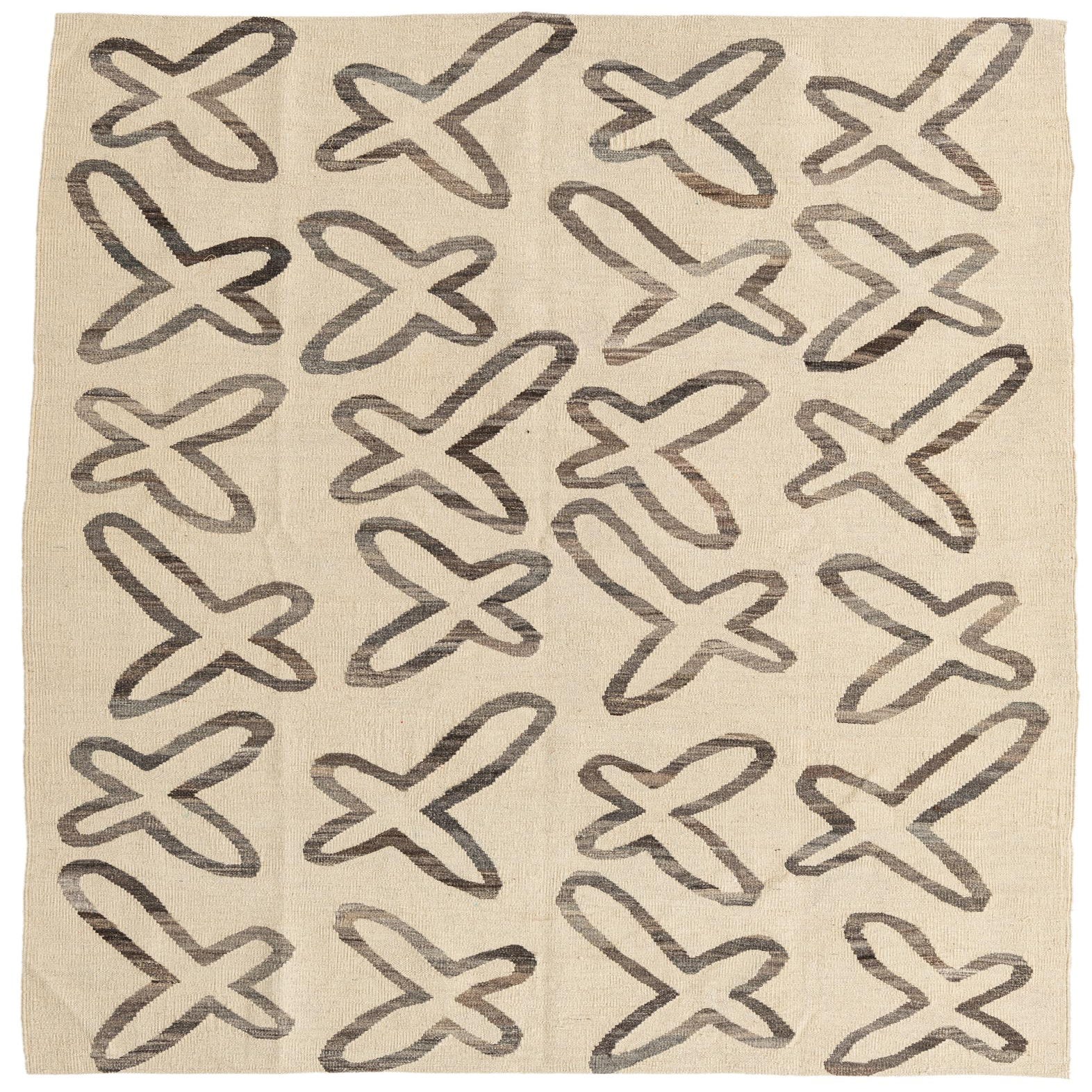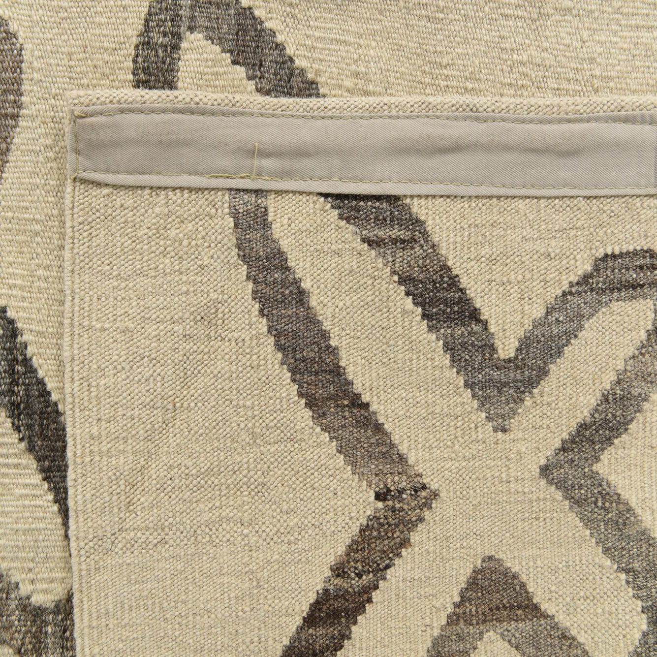 A 5x8 rectangular Kilim Modern wool rug with an ivory background and abstract brown tribal patterns.