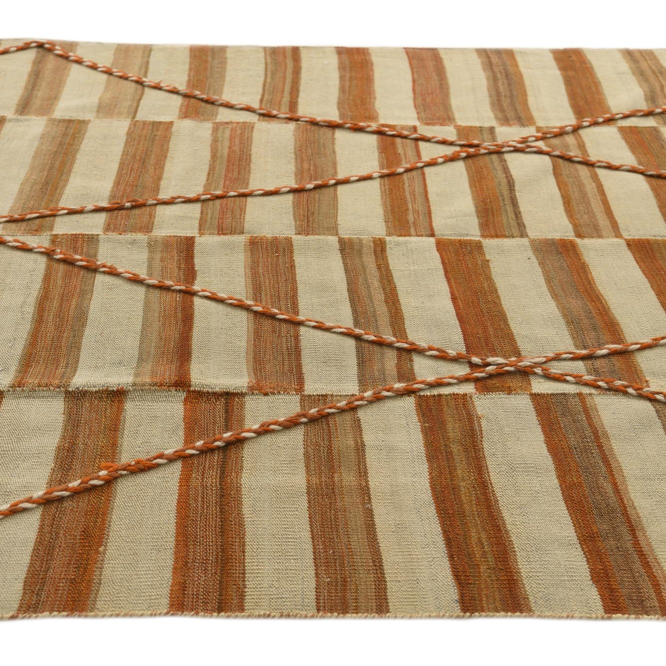 A 5x8 rectangular Kilim Modern rug with horizontal stripes in varying shades of brown, tan, and cream, accented by a braided orange diamond pattern.