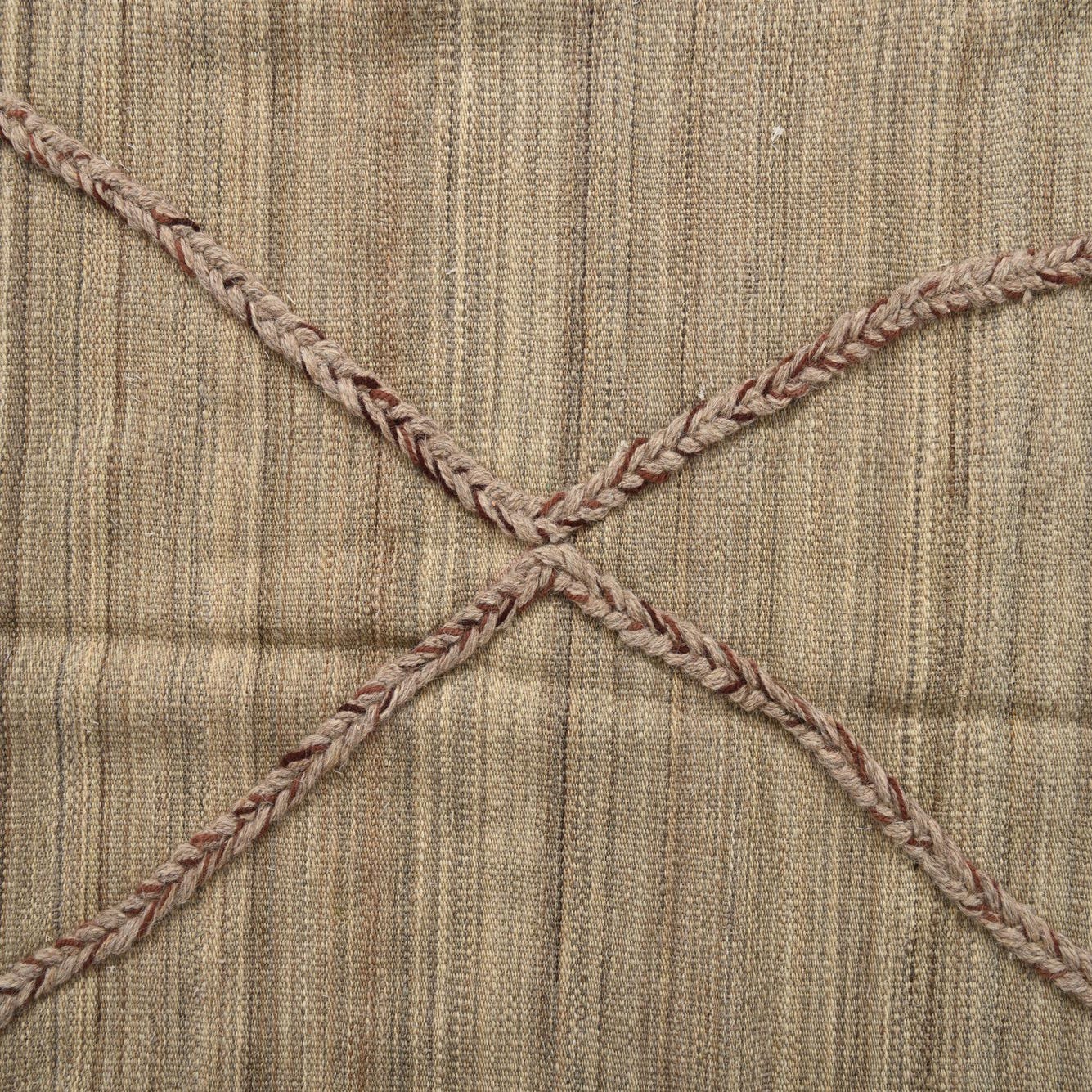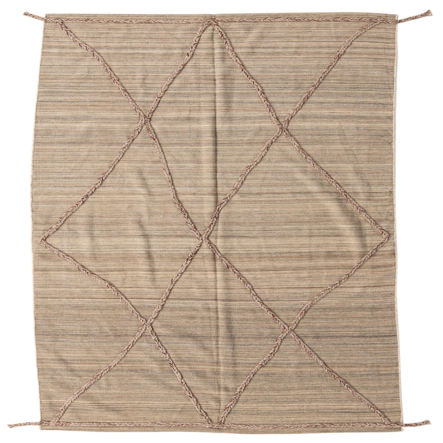 A 5x8 rectangular Kilim Modern wool rug in brown and ivory, featuring a tribal diamond pattern with braided accents.
