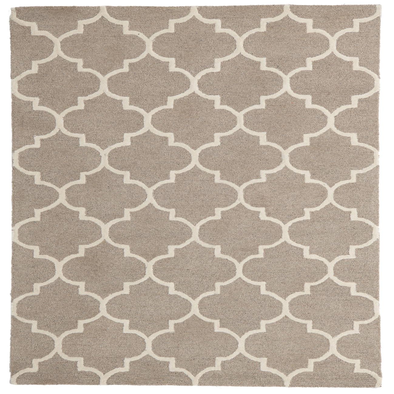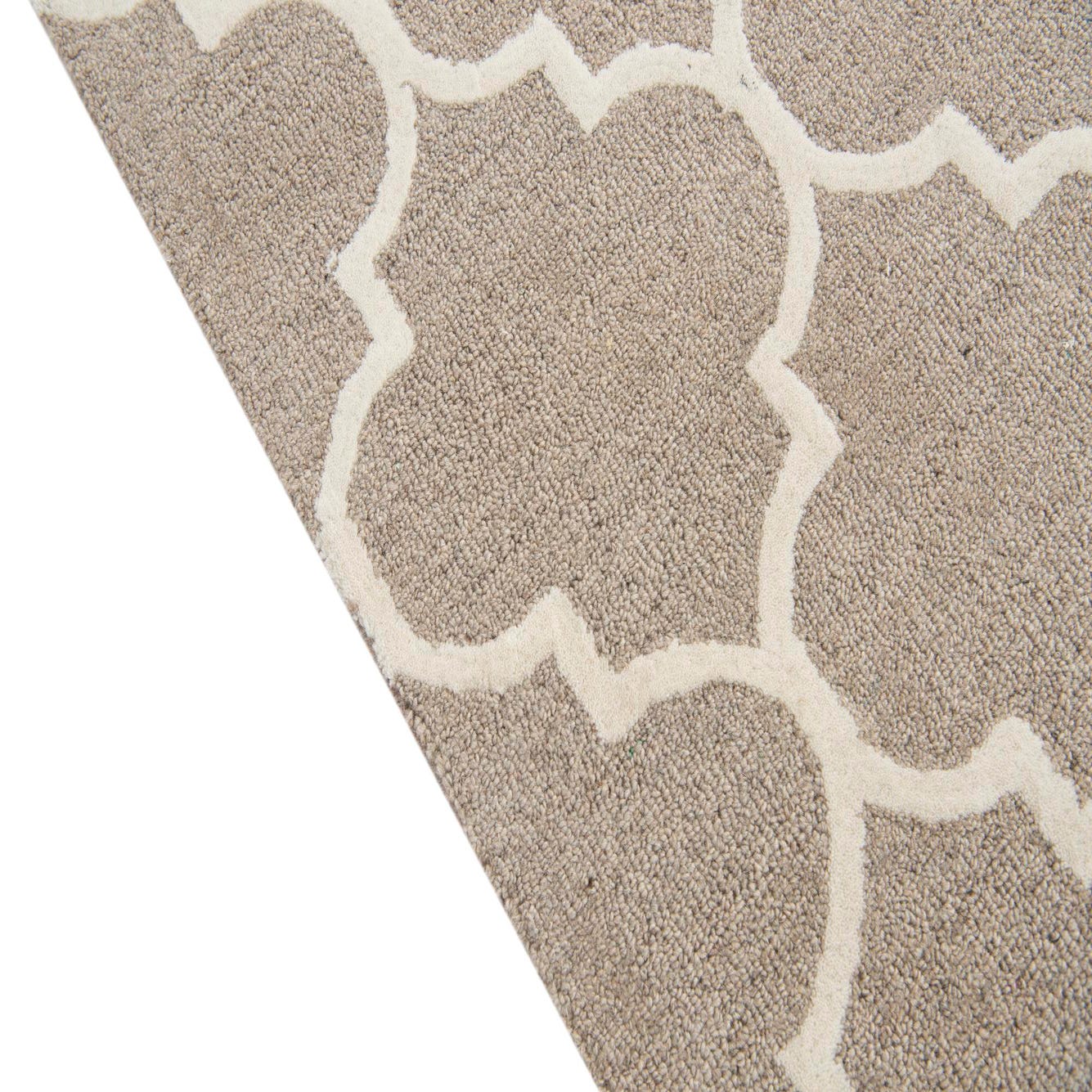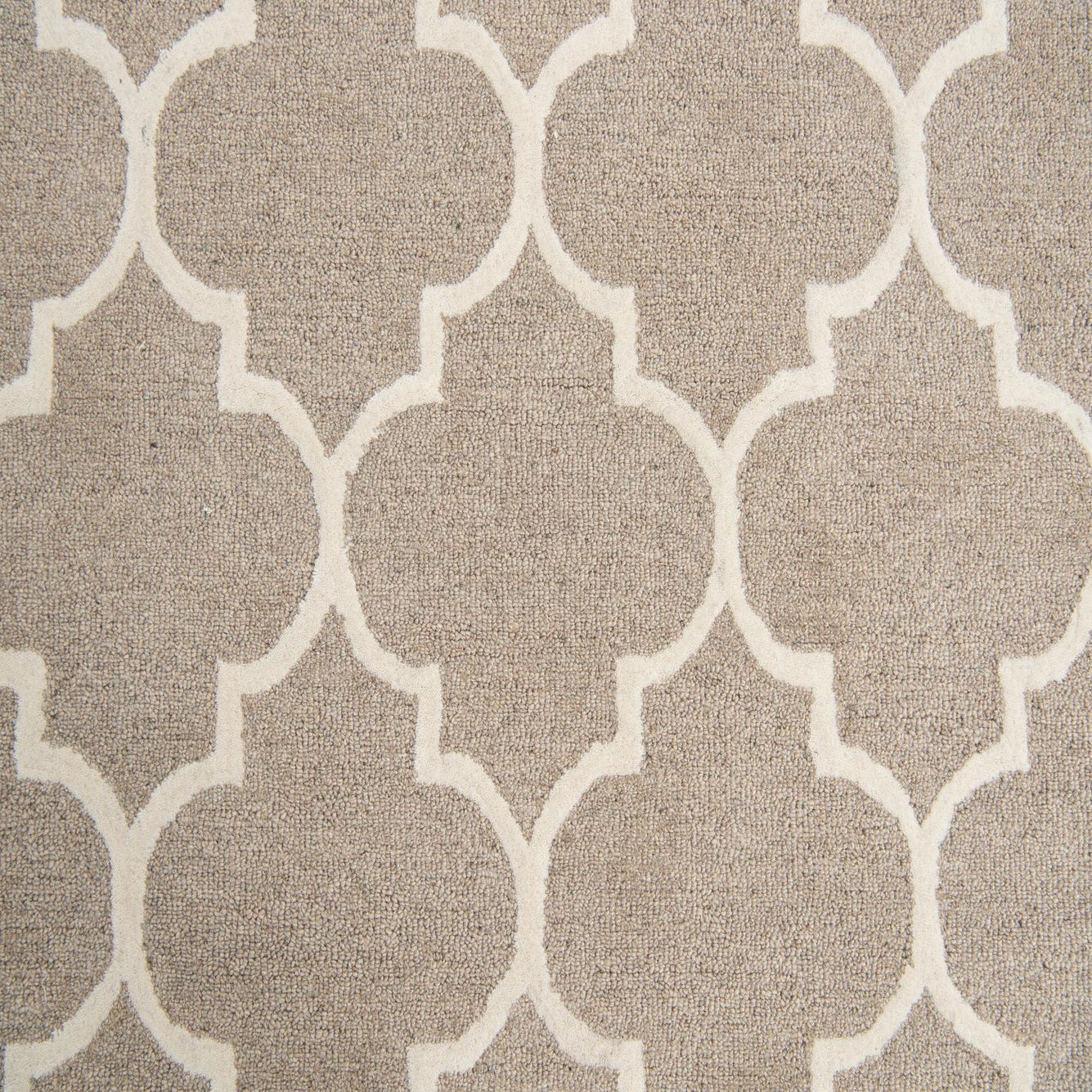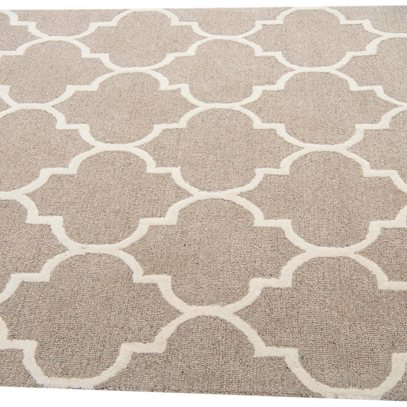 The Luna Collection presents a 5x8 hand-tufted rug expertly crafted from a harmonious blend of wool and cotton. The design features a repetitive lattice pattern, creating an elegant array of interconnected, curvilinear shapes that offer both visual interest and structural harmony. The beige background serves as a neutral base that is pleasantly contrasted by the ivory outlines, producing a cohesive and inviting color palette.