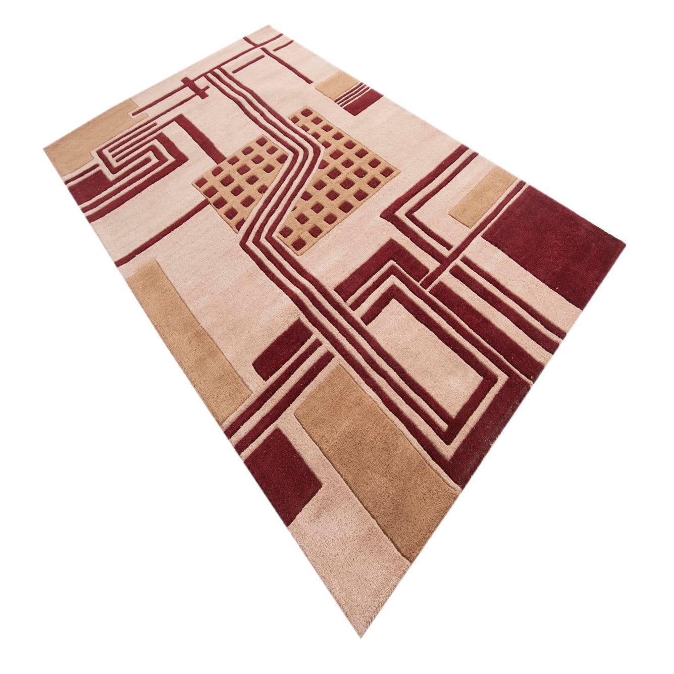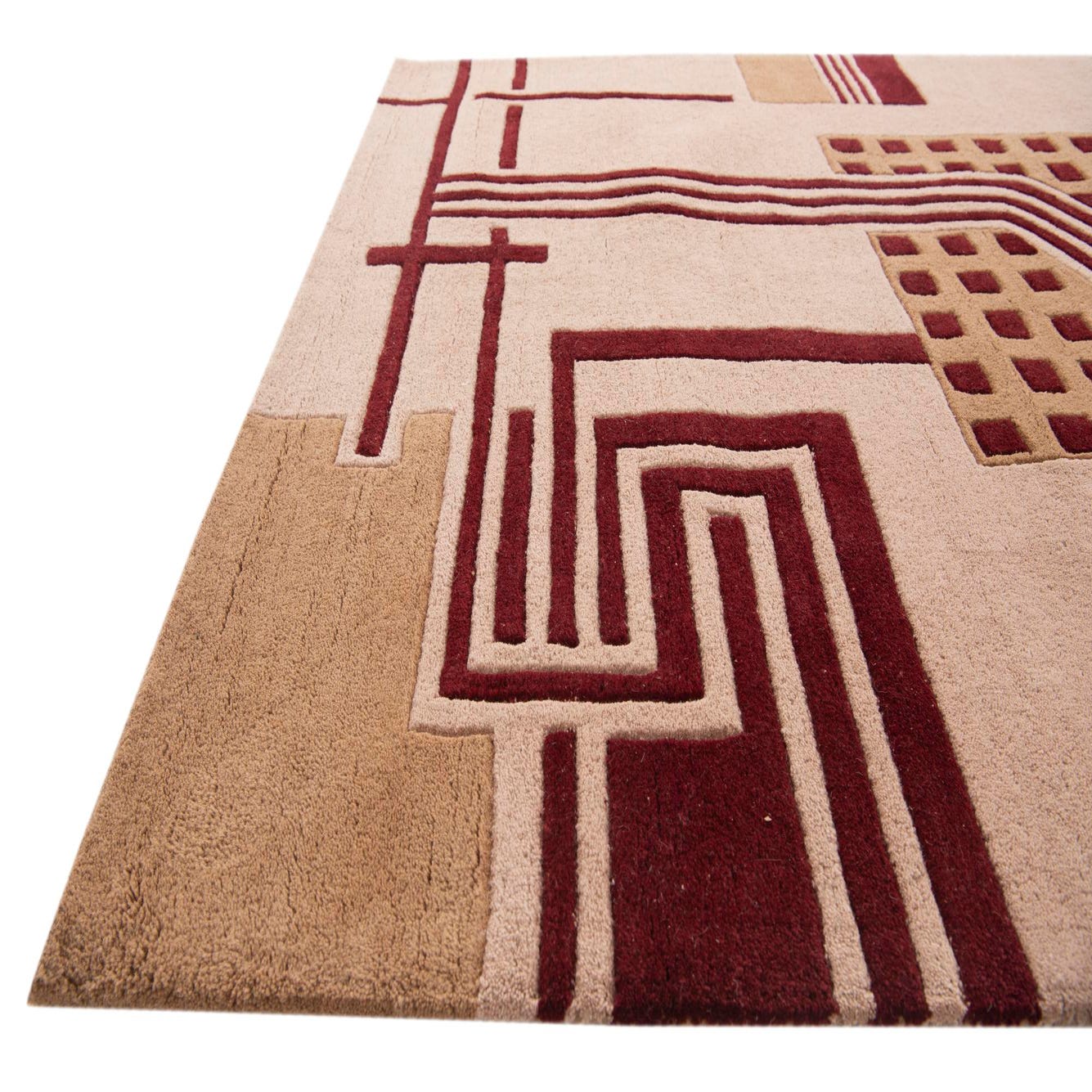 A modern geometric layout of intersecting lines, grids and rectangular blocks sits on a warm beige field, with deep red bands and light brown accents providing contrast and structure. The pattern alternates linear pathways with a checker-like block, creating a composed, architectural feel that draws the eye without overpowering the room. Hand-tufted of wool and cotton, the rug has a plush cut pile with gently raised areas where the pattern is defined, delivering a soft, tactile surface underfoot and a modest dimensionality to the design.