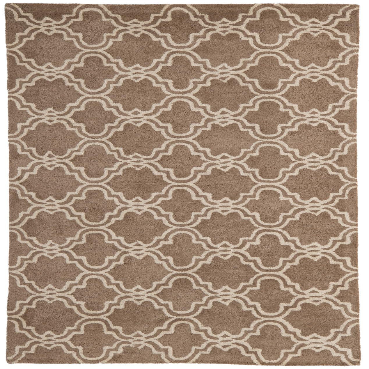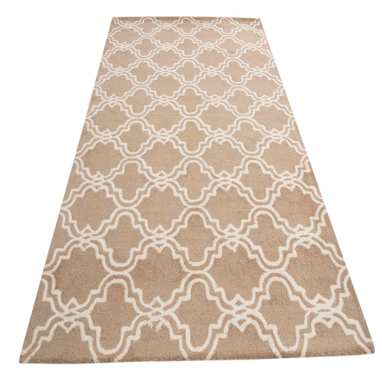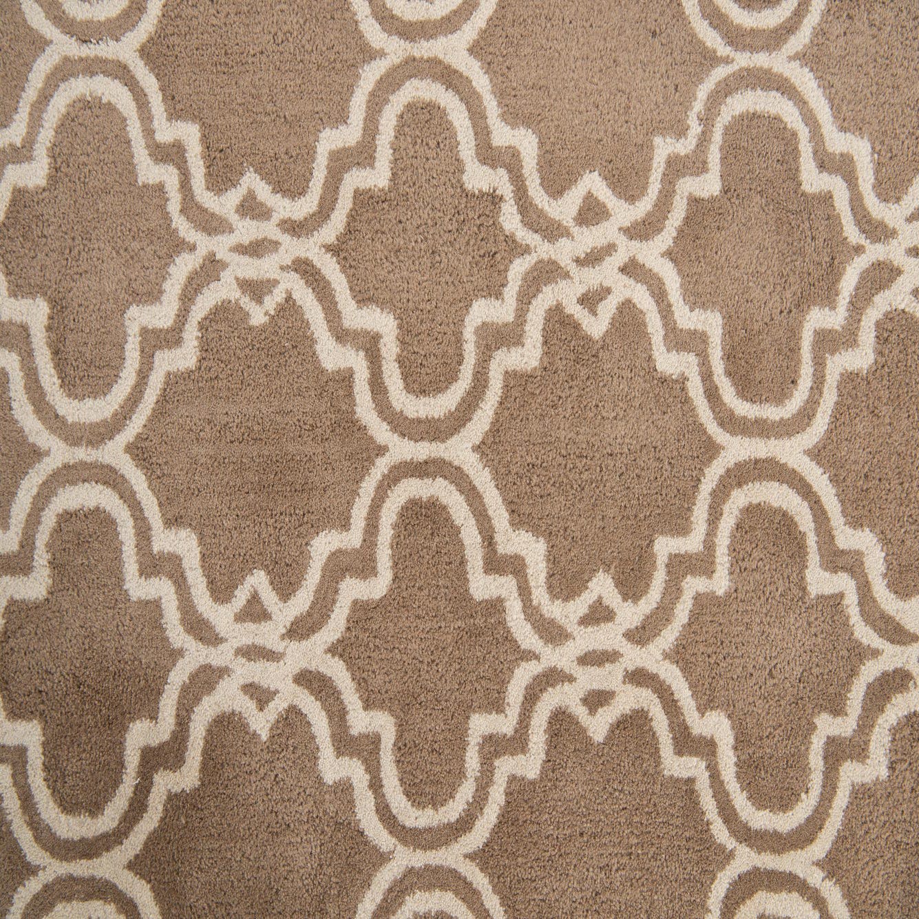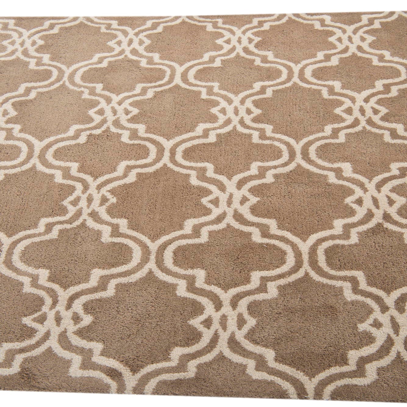The design features an interconnected, geometric quatrefoil motif that brings a touch of elegance to any space. The beige background is complemented by ivory outlines, creating a subtle yet engaging contrast. The rug's texture adds a tactile dimension that enhances the visual interest of the pattern.