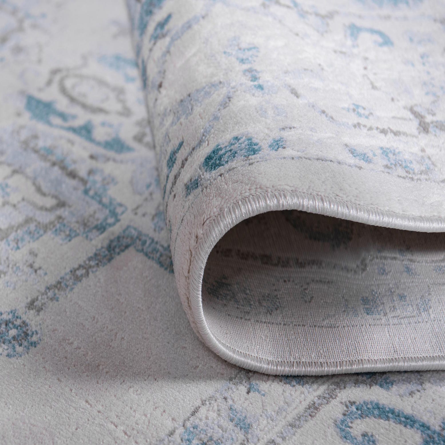 This rug fits seamlessly in transitional and coastal-inspired interiors as well as contemporary-traditional rooms. Place it beneath a neutral sofa and natural wood coffee table to add quiet pattern to a living area, layer it under the lower two-thirds of a bed for a serene bedroom anchor, or center it beneath a small dining set to introduce soft color and classic formality without overpowering the space. Pair with linen textiles, light wood finishes, and pale blue or gray accents to bring out the rug’s colorway and enhance a calm, cohesive palette.