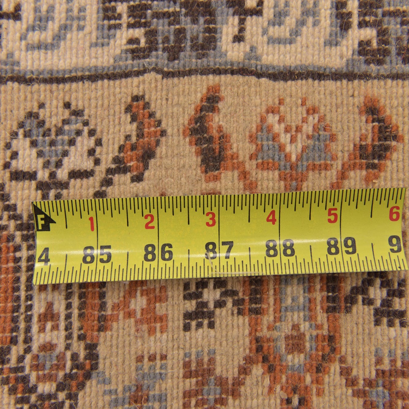 Primary color is Beige. Colors in this rug include: Beige, Blue, Navy Blue, Orange, Ivory.