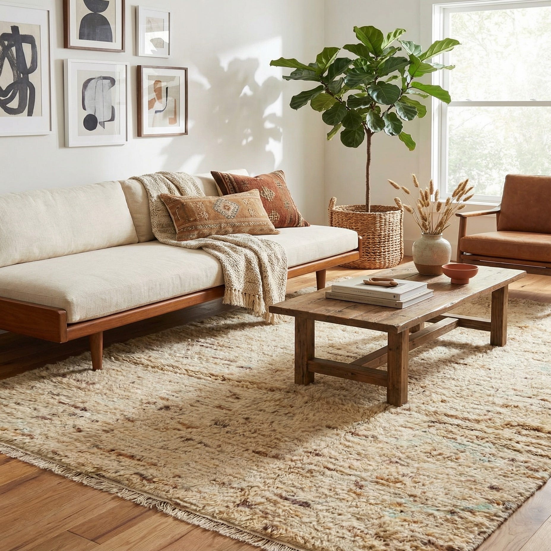 A 5x8 rectangular shag rug in warm brown and cream tones with subtle tribal patterns, suitable for a living room.