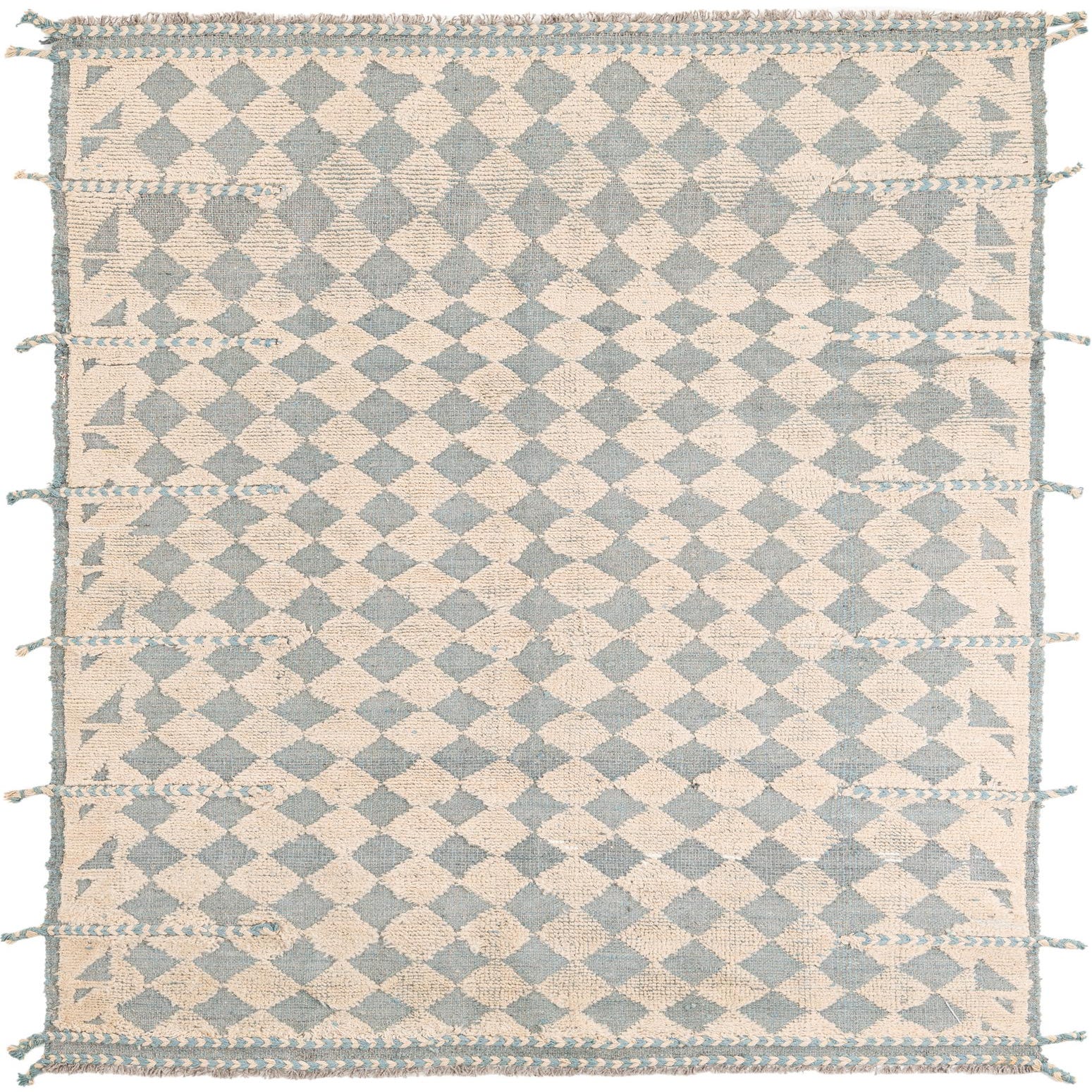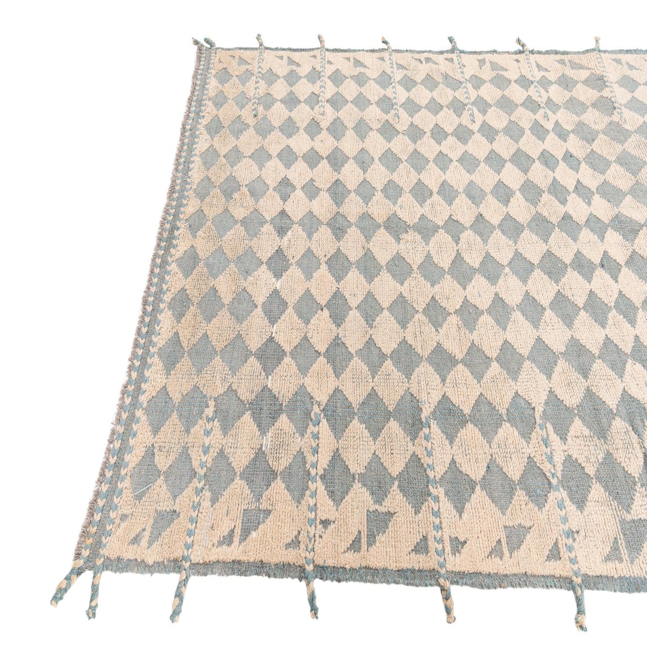 A 5x8 rectangular Moroccan shag rug with a tribal diamond pattern in light brown and cream, featuring decorative tassels.