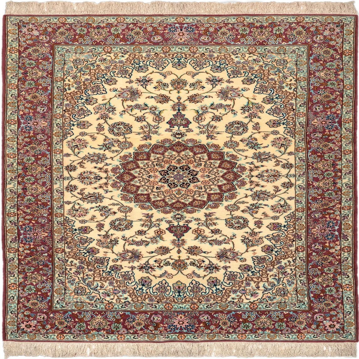 A 5x8 rectangular Persian rug with a cream field, intricate floral medallion, and a rich brown border.