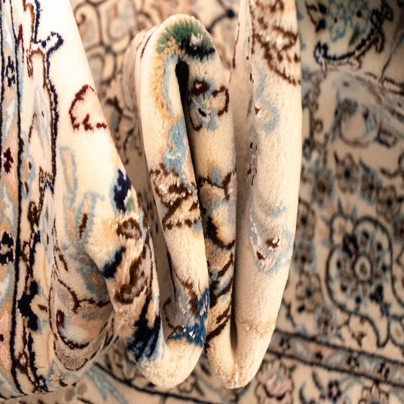 The texture of the rug, created by the high-quality wool and silk, presents a soft, plush feeling underfoot, while also ensuring durability. The craftsmanship is evident in the fine knotting and the subtle sheen provided by the silk, which adds a touch of elegance to the overall appearance.