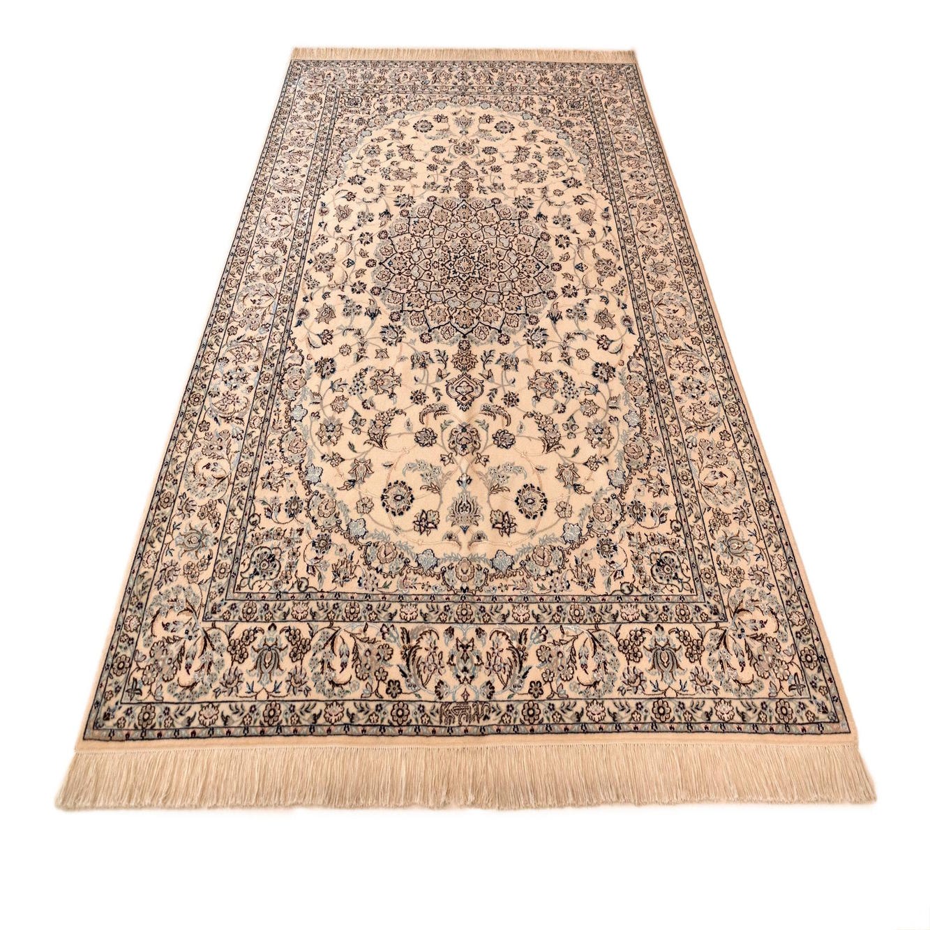 The Nain Collection offers a hand-made rug with a sophisticated blend of wool and silk materials. This 5x8 rug showcases a traditional design featuring a beige background with intricately detailed floral and foliate motifs in a harmonious palette. The border is characterized by a series of decorative bands, each filled with repeating patterns that complement the central medallion.