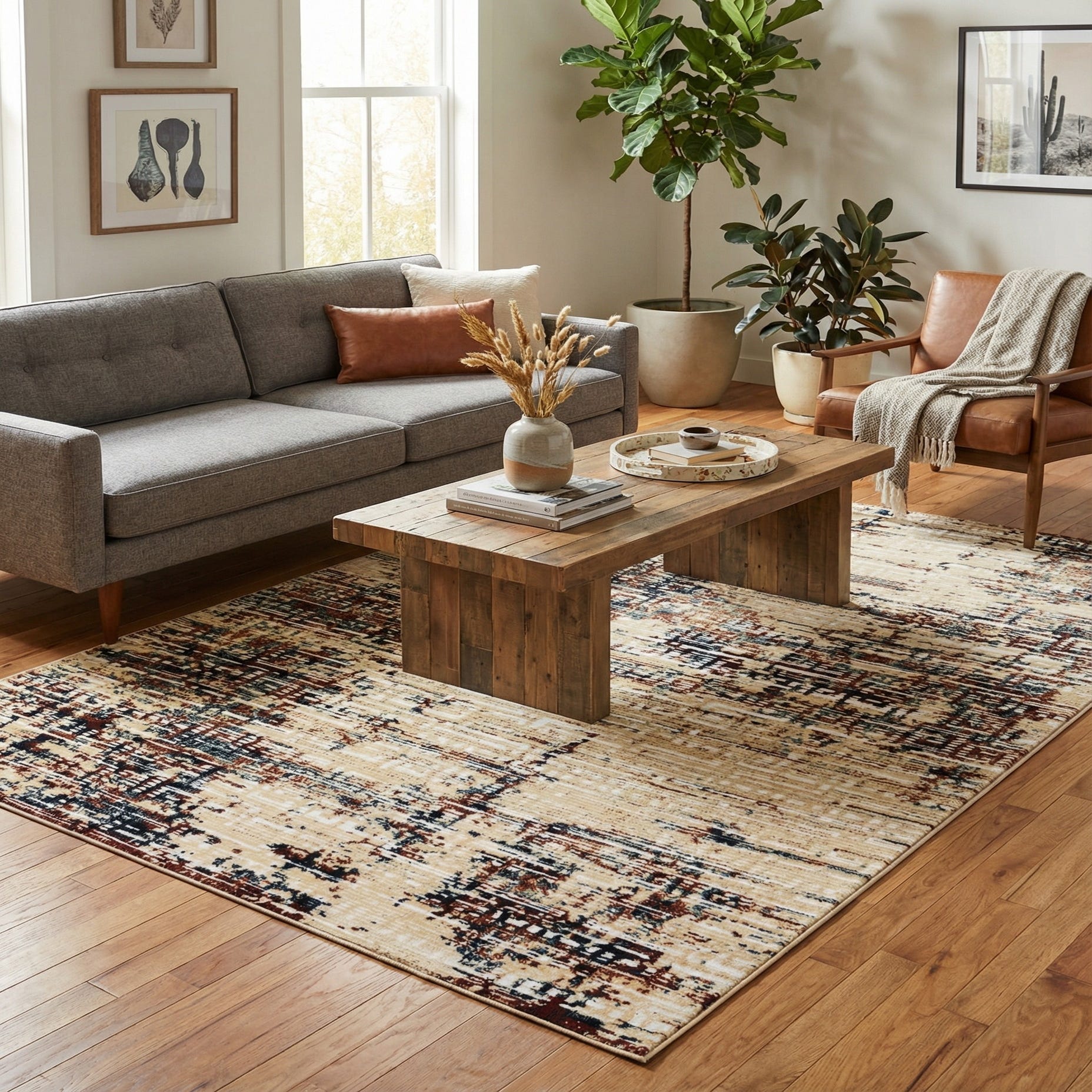 A warm beige field forms the backdrop for a layered, distressed pattern that blends linear striations with mottled patches in ivory, navy blue and red. The abstract design balances open space with concentrated color, giving the rug a lived-in, textured appearance. Machine made from 70% polypropylene and 30% polyester, the low-profile pile feels soft underfoot with a slight sheen where polyester fibers catch the light.
