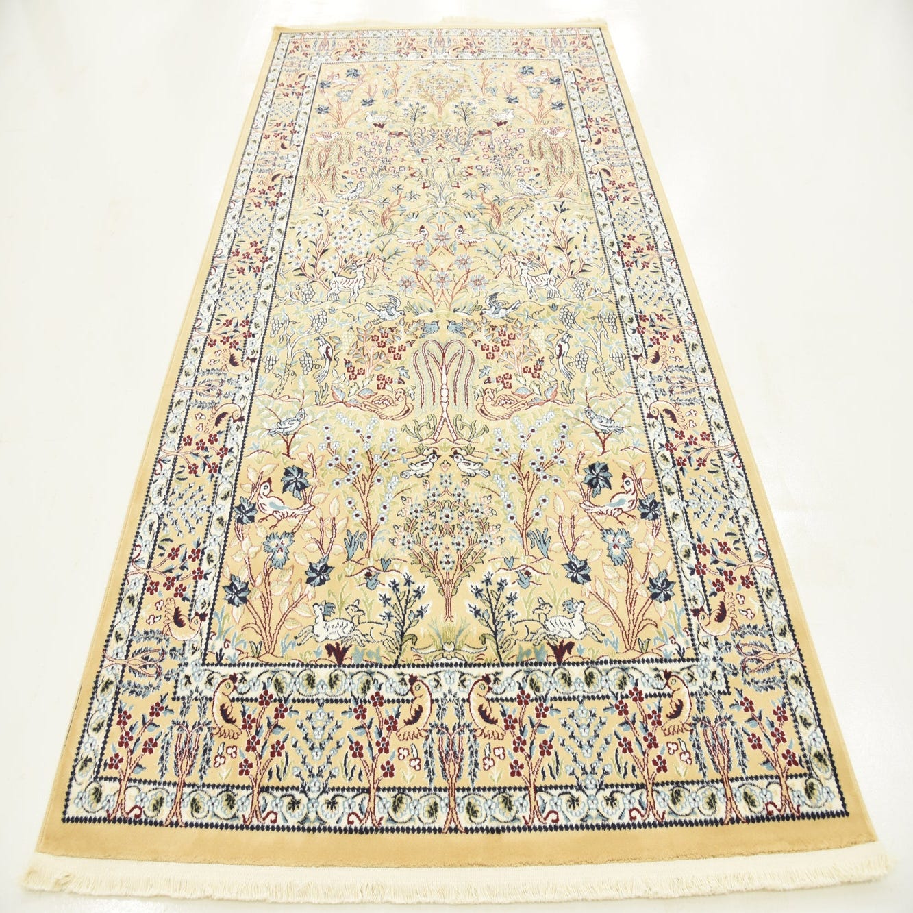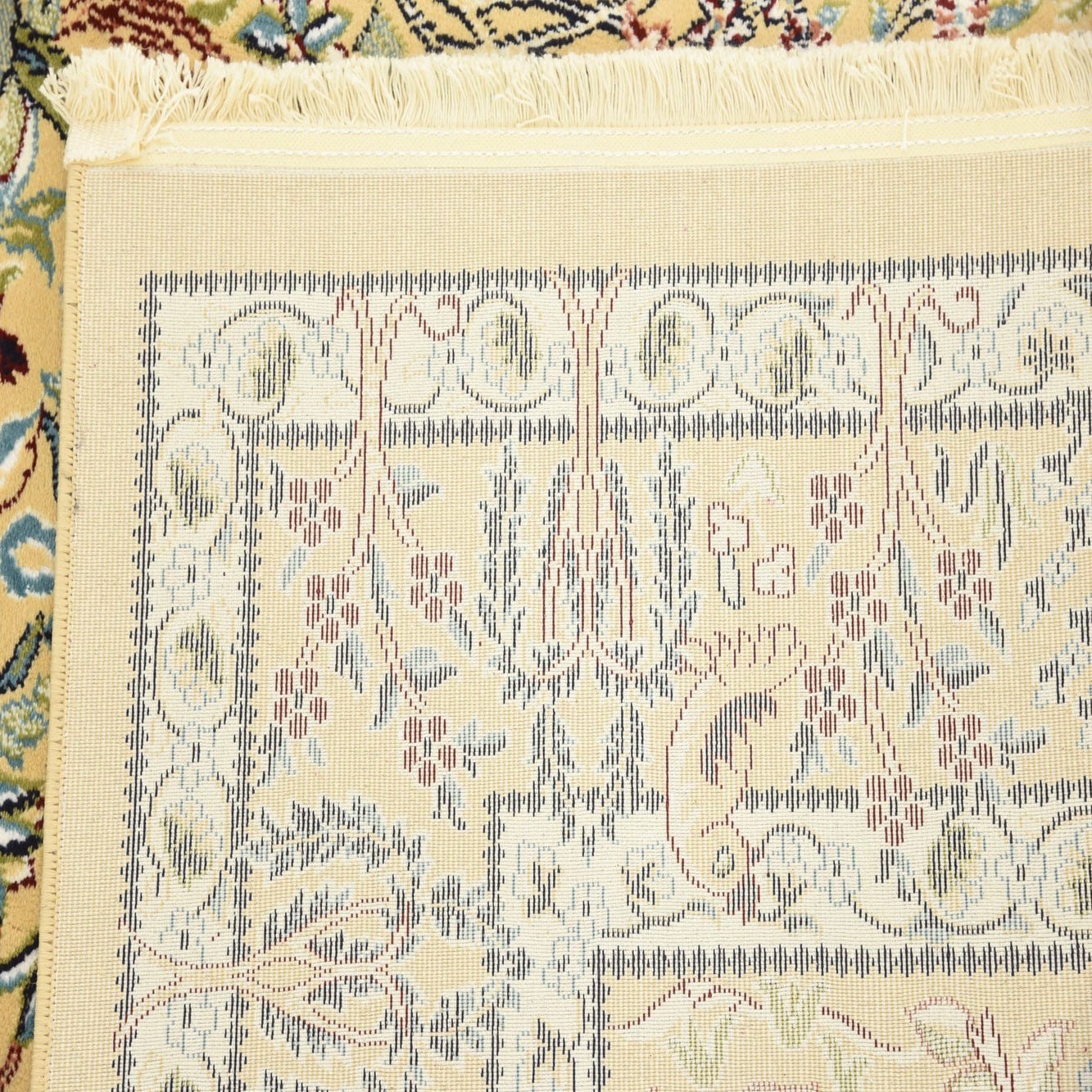Primary color is Beige. Colors in this rug include: Beige, Blue, Burgundy, Cream, Green, Ivory, Navy Blue, Puce.