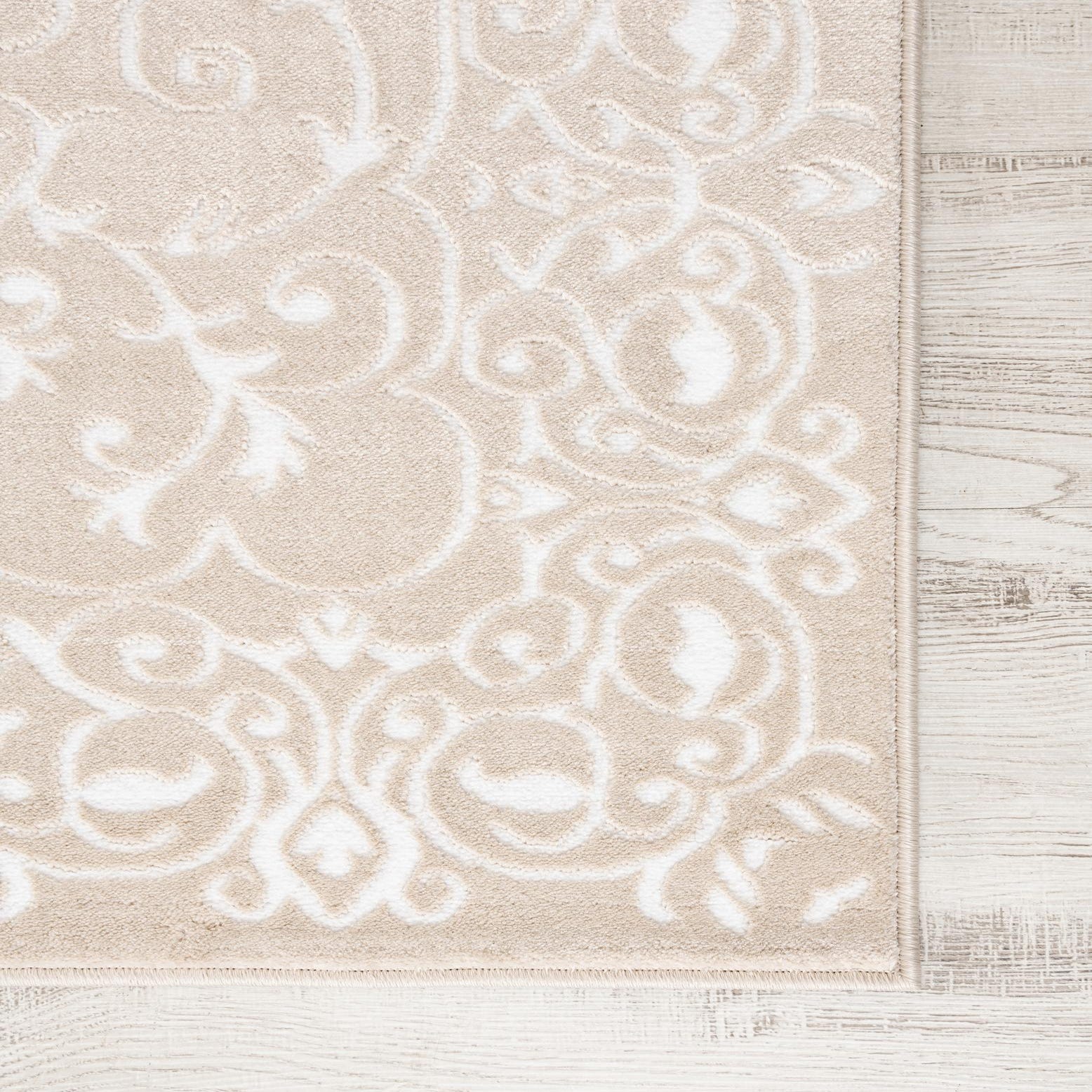 A soft beige field provides a calm, neutral backdrop for an ornate ivory medallion and scrolling arabesque pattern. The machine-made construction in 55% polypropylene and 45% polyester produces a low-profile pile with a subtle sculpted effect — the ivory motif lifts gently above the base so you can feel the design underfoot while the surface keeps a smooth, slightly lustrous finish. The overall look is a modern take on traditional motifs, with clean edges and delicate detailing that keeps the pattern elegant without overpowering a room.