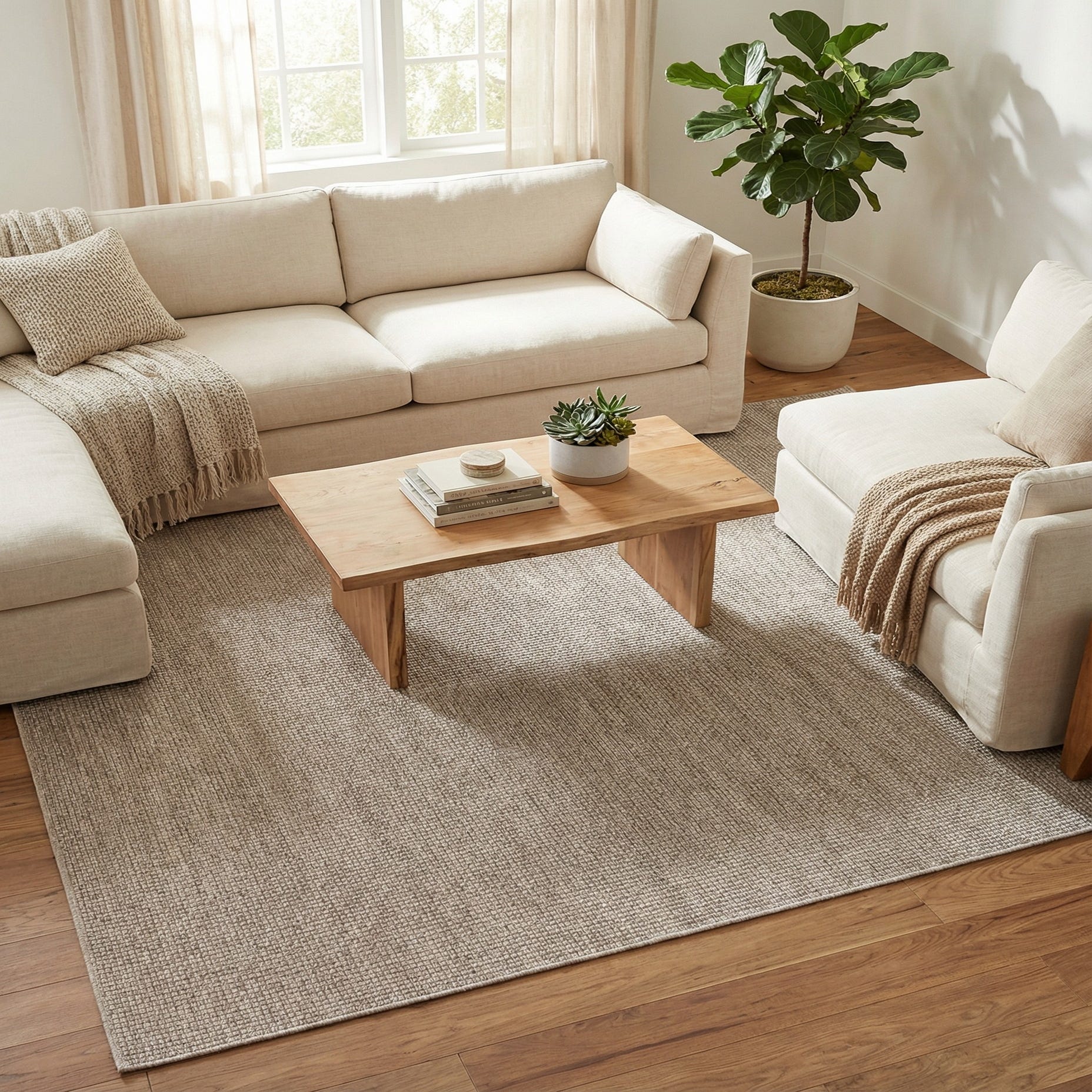 This rug works well where you want a muted, versatile foundation: under a casual dining set, on a covered patio or sunroom, layered over hardwood in a living room, or placed beneath a bistro table. Pair it with light wood furniture, coastal or Scandinavian accents, or simple metal-framed pieces for a modern, relaxed feel that won’t compete with patterned upholstery or outdoor cushions.