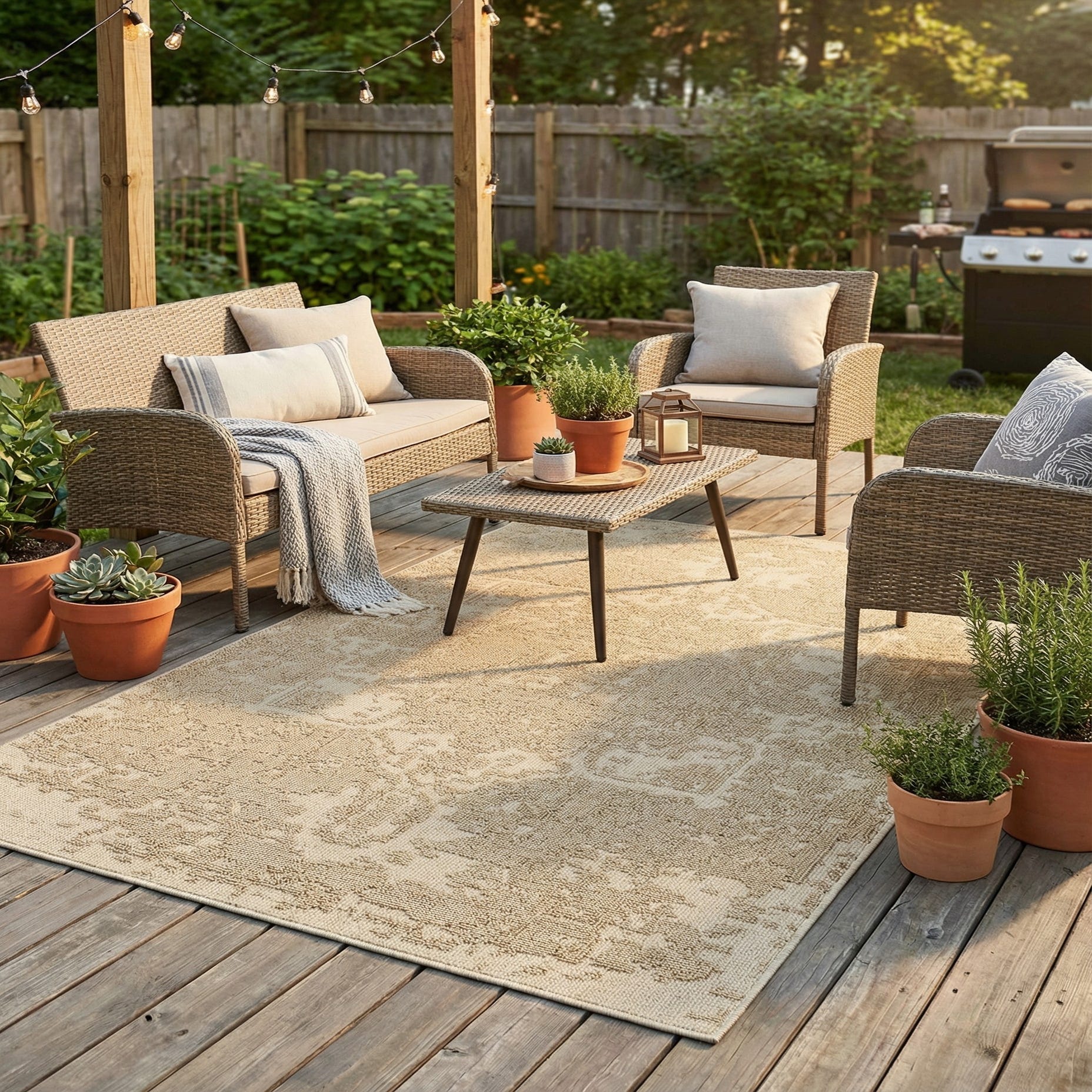 This piece pairs easily with neutral, coastal, or modern farmhouse palettes—think linen slipcovered sofas, wicker or teak outdoor seating, or a dark wood dining table for contrast. It works well on a covered patio or sunroom, in a casual living room to ground seating, or layered over a flat-weave for added dimension in transitional interiors. The understated beige makes it a versatile anchor that complements both cool grays and warmer wood tones.
