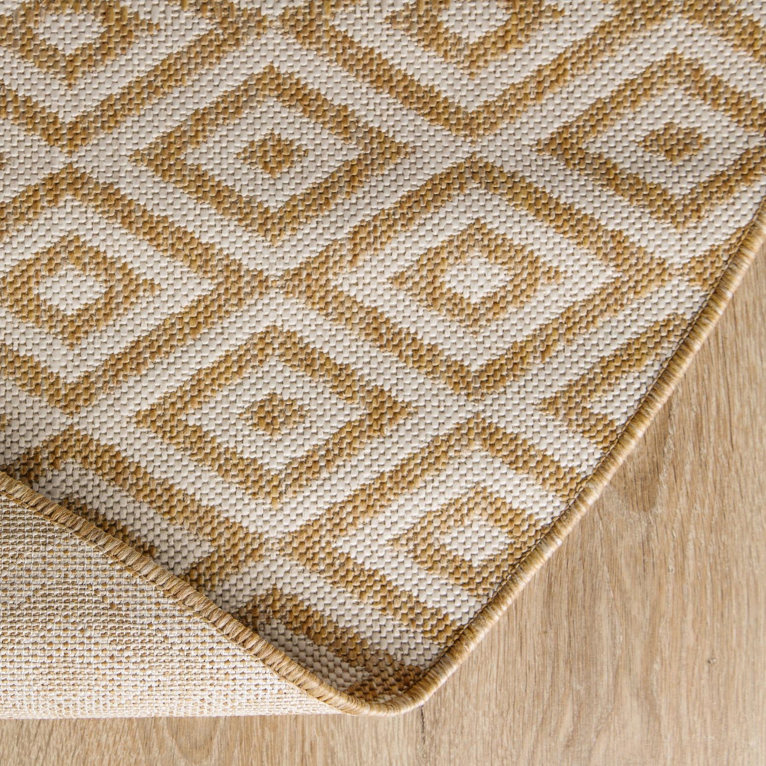 The Jill Zarin Outdoor Collection presents a stylish 5x8 oval rug, machine-woven from 100% polypropylene for exceptional durability and ease of care. This piece boasts a beige background complemented by cream accents, featuring a geometric diamond pattern that offers a modern take on classic design. The rug's flatweave construction ensures a smooth underfoot texture, and its stain-resistant properties make it a practical choice for high-traffic areas.