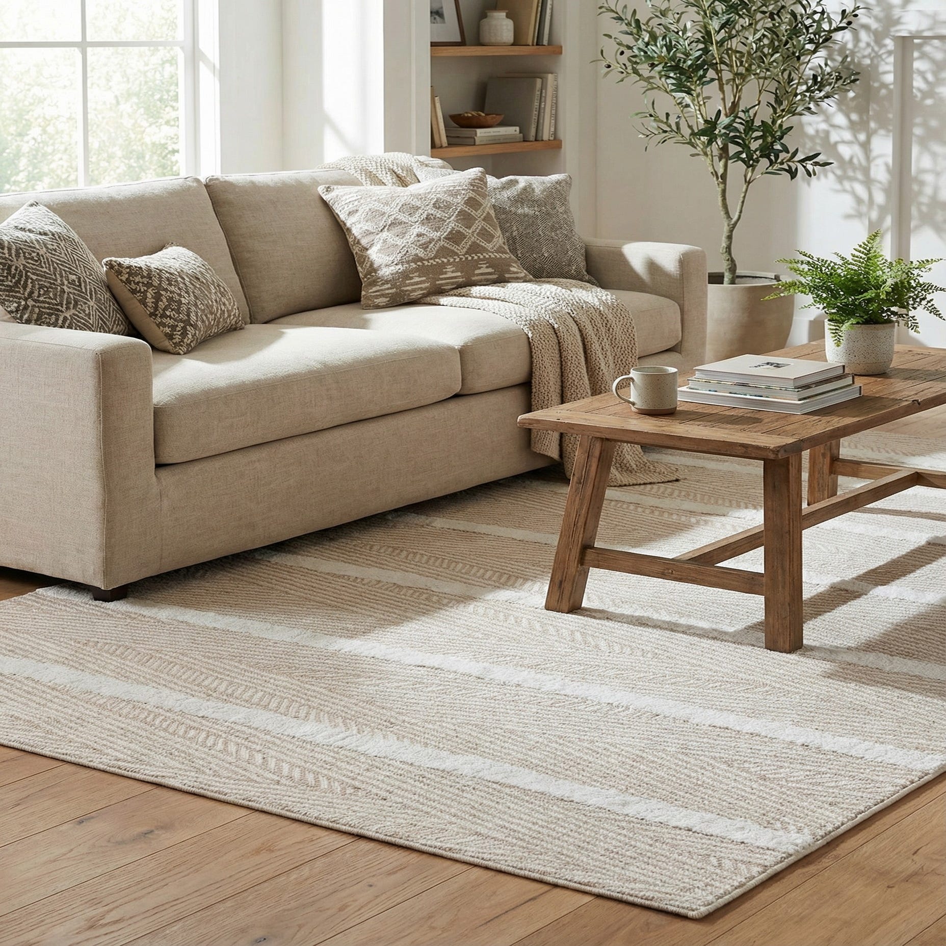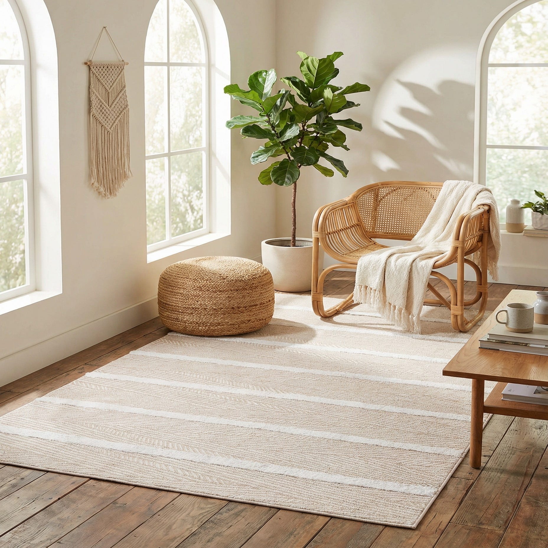 The neutral palette and understated pattern work well in contemporary, Scandinavian, coastal, or modern farmhouse interiors. Pair it with light wood furniture, linen upholstery, and matte-metal accents for an airy living room, layer it at the foot of a bed to warm a bedroom, or place it under a dining table where its flat cotton construction fits naturally under chairs.