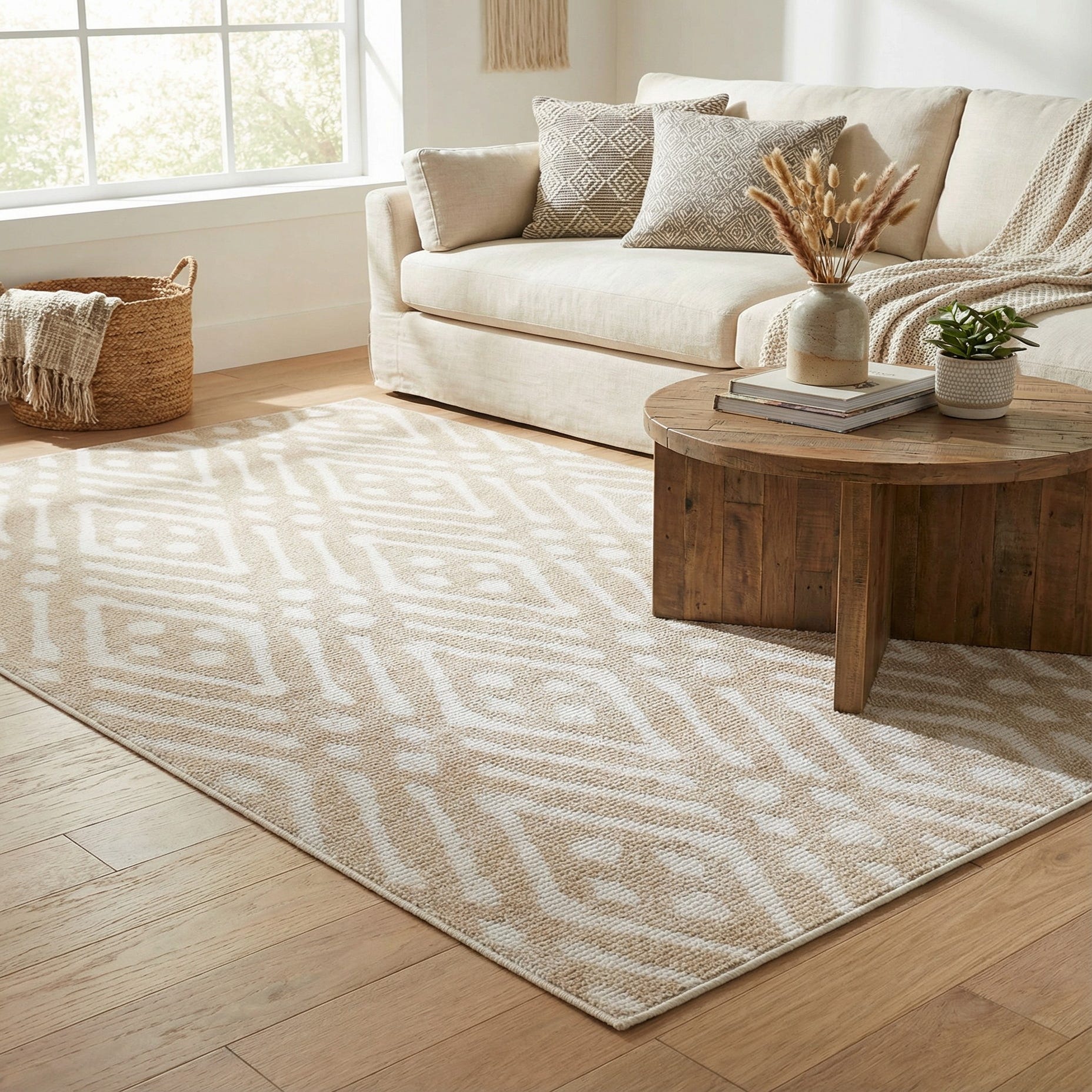 A soft cream geometric diamond pattern sits against a warm beige background, forming a repeating motif of elongated diamonds and small dot accents. The design balances contemporary lines with a subtle, traditional influence, creating a calm, layered look that complements neutral interiors without overwhelming them.