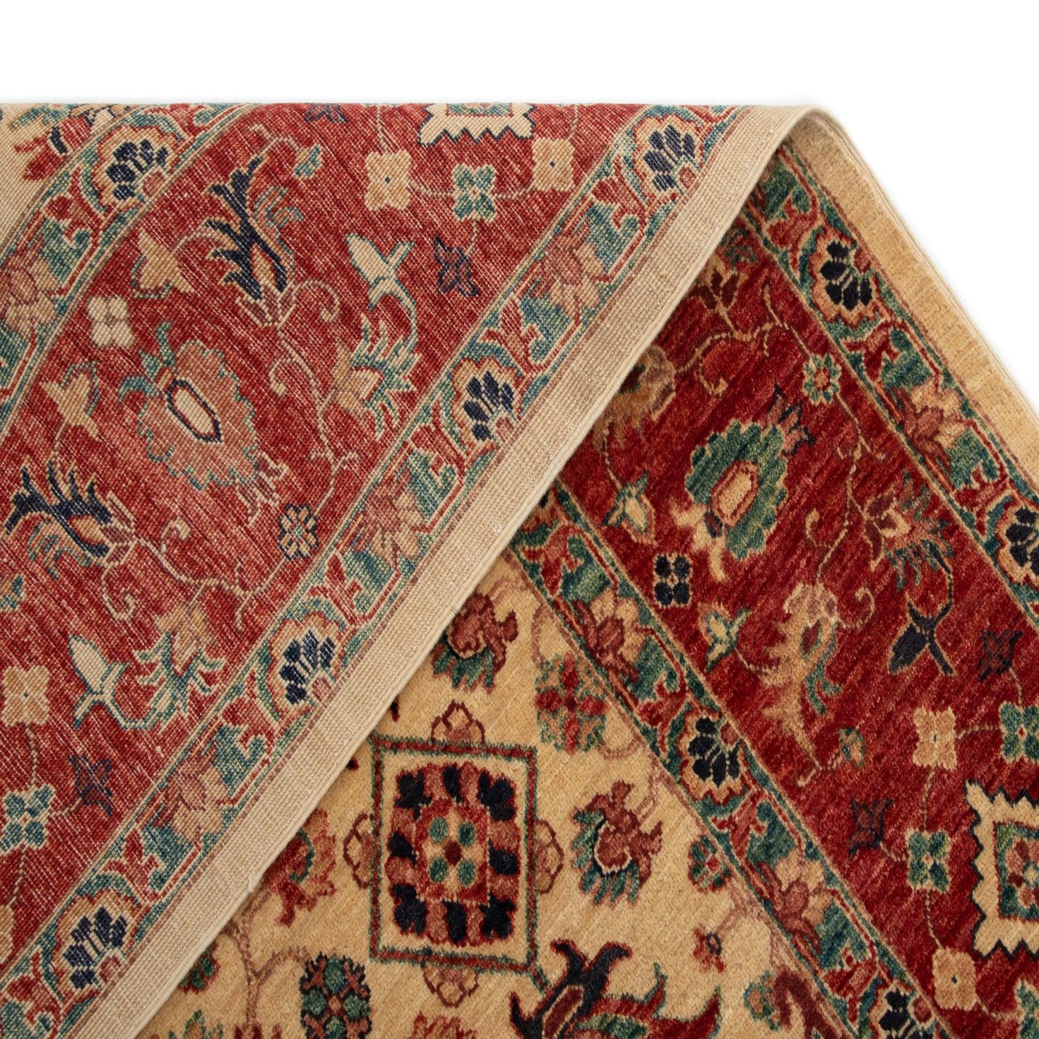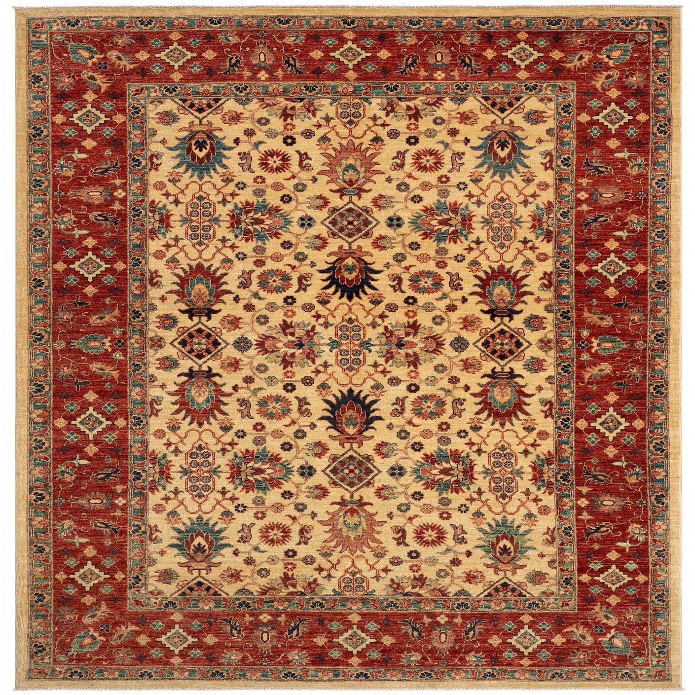 Primary color is Beige. Colors in this rug include: Beige, Beige, Red, Green, Brown, Dark Blue.