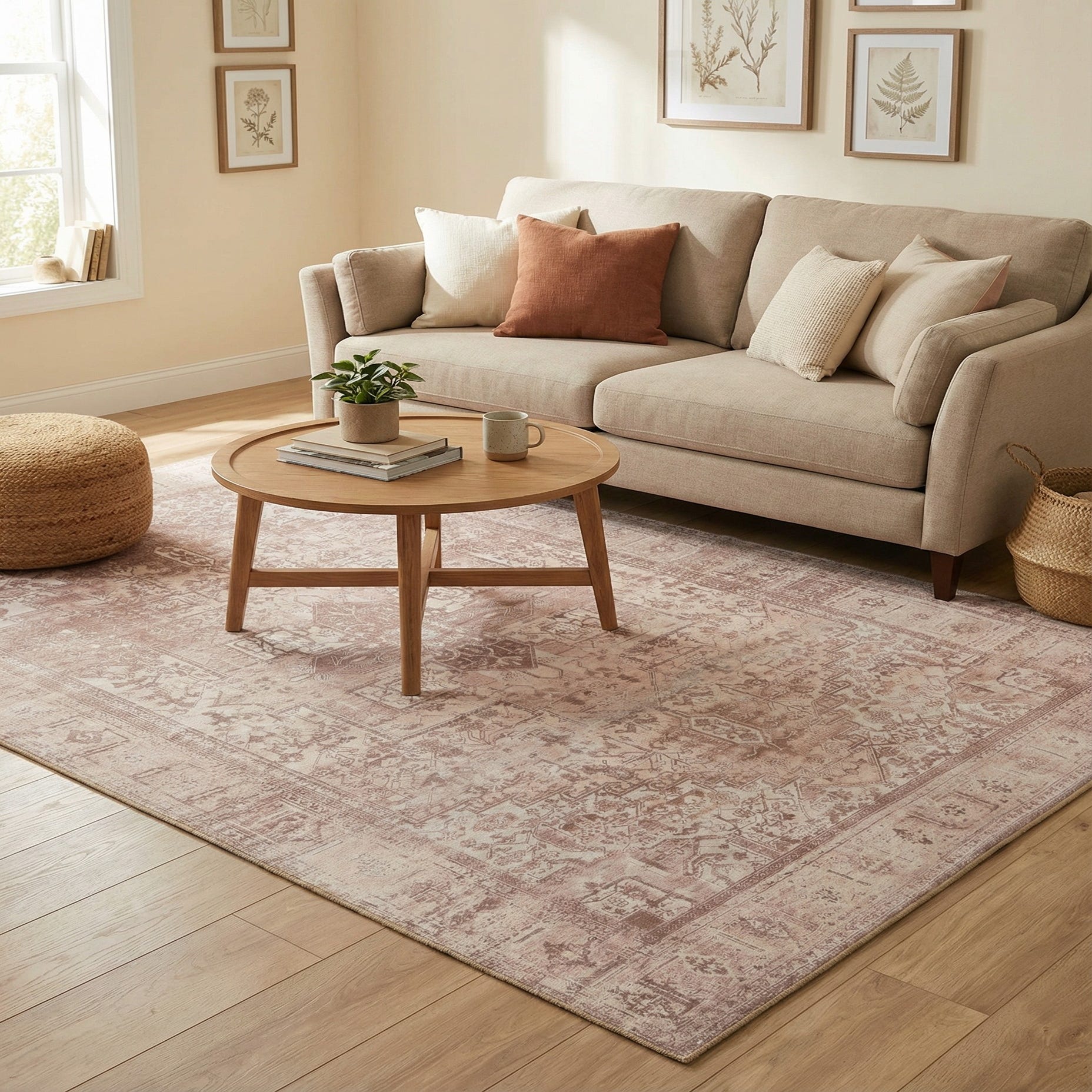 A softly distressed, vintage-inspired medallion pattern unfolds across a warm beige background, with delicate floral and geometric motifs worked in ivory and light brown. The border carries the same faded detailing, creating a layered, timeworn effect that reads as refined but relaxed. The overall look pairs traditional rug geometry with a muted palette for a calm, lived-in aesthetic.