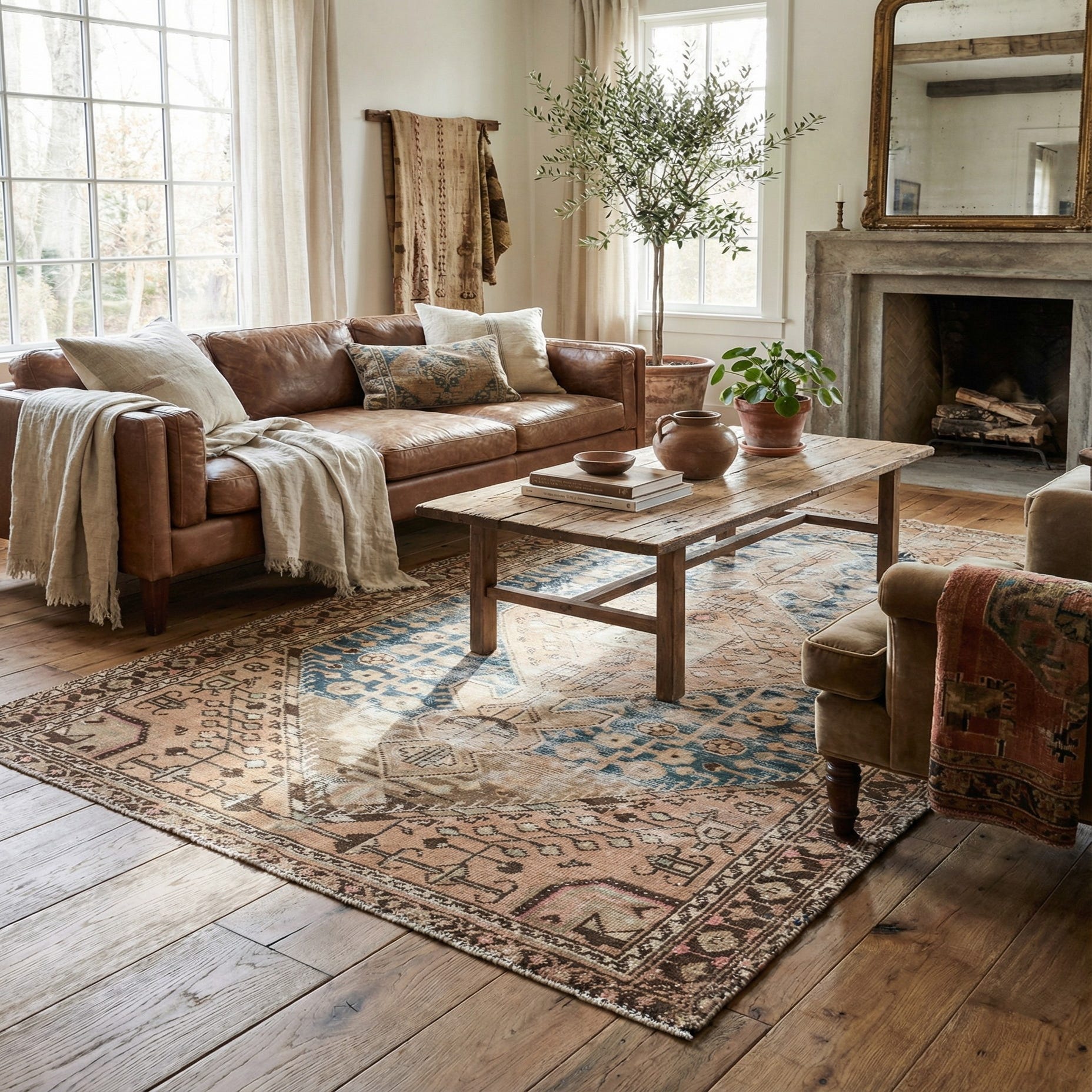 A 5x8 rectangular Ultra Vintage Persian rug with a faded brown and ivory medallion pattern on a blue field.