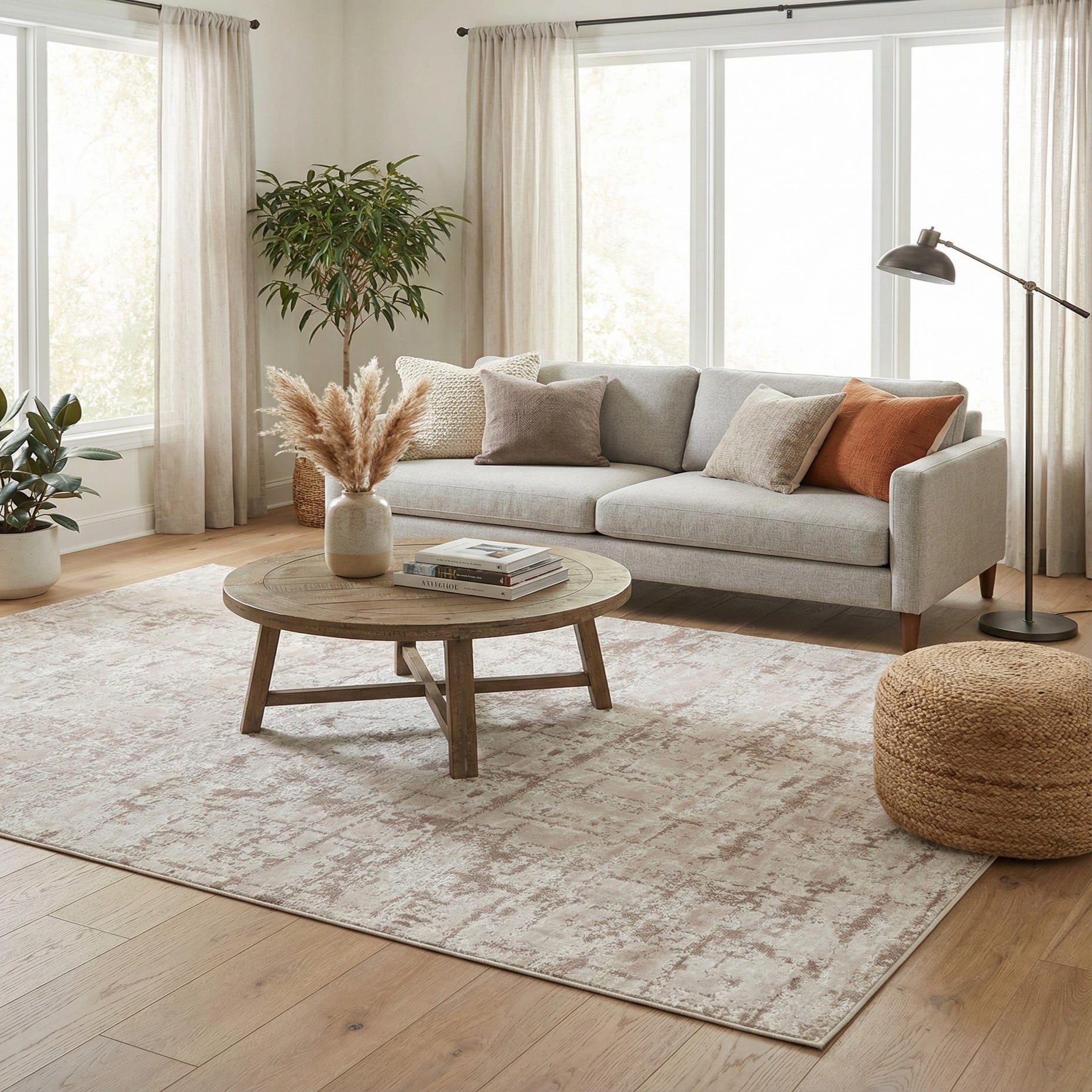 This neutral palette and understated texture work well in living rooms and bedrooms where a calm foundation is needed, or beneath a dining table to let furniture finishes take center stage. Pair it with light wood tones, soft linen upholstery, and matte metal accents for a contemporary or Scandinavian-inspired scheme, or layer it with textured throws and woven baskets to soften a transitional space. The rug also complements minimalist interiors that favor clean lines and a warm, cohesive color story.