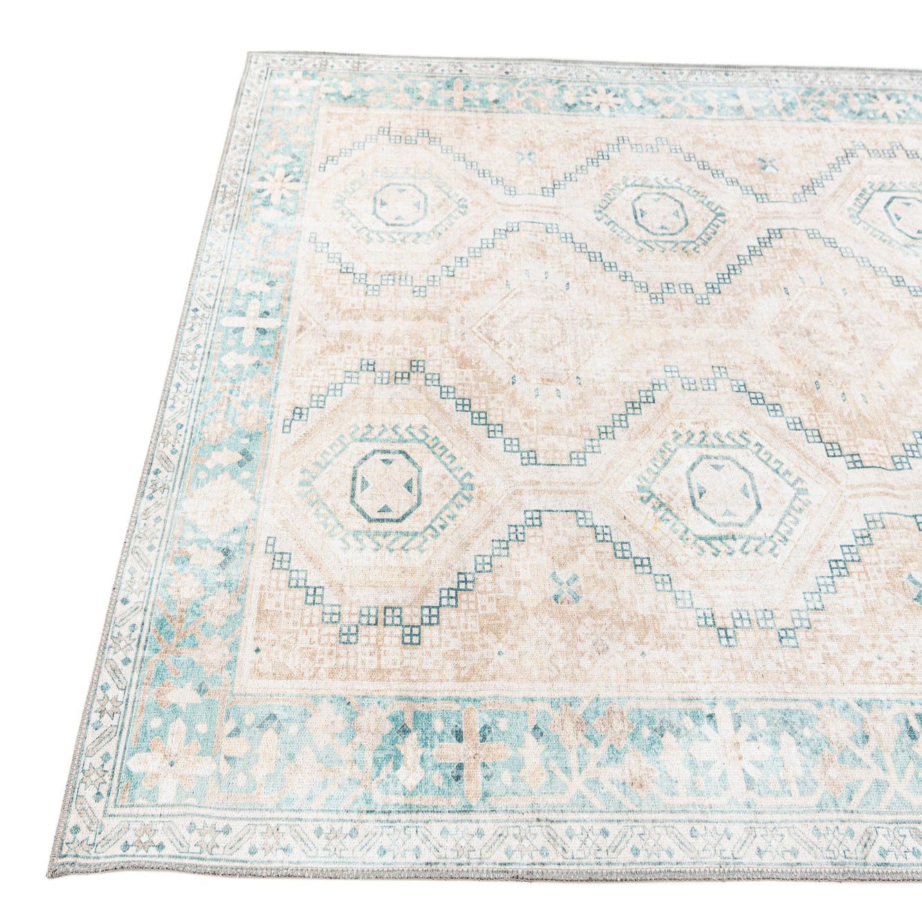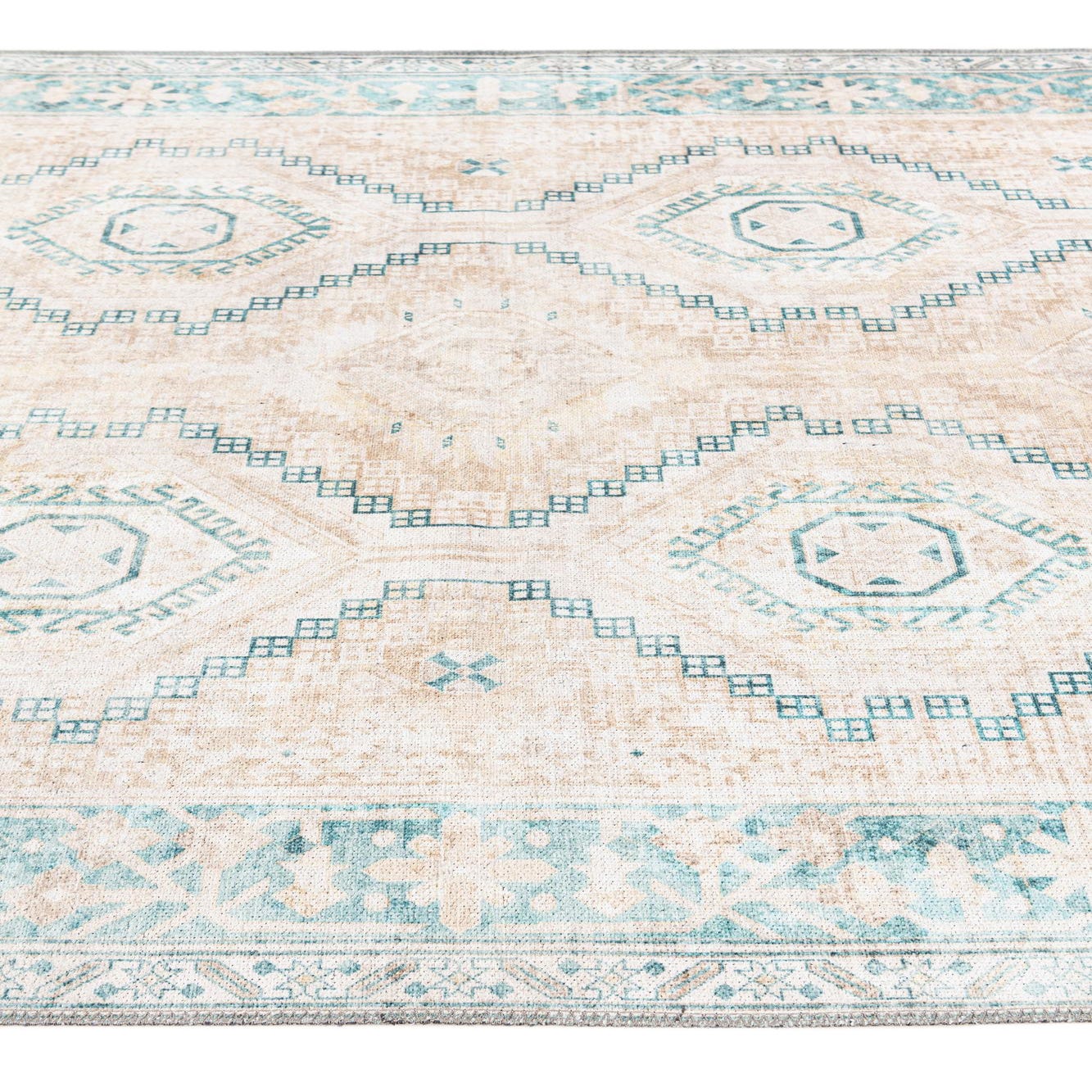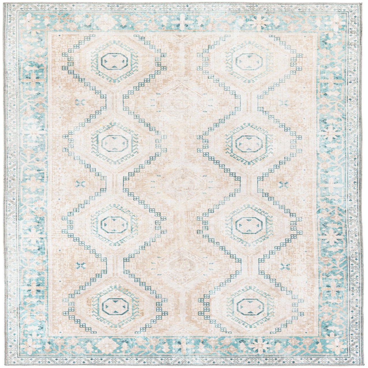 A soft beige ground sets a calm backdrop for an arranged series of stepped diamond medallions and geometric motifs in ivory, green, and brown. The field has a gently distressed, vintage-inspired appearance with a narrow decorative border in green and ivory that frames the design. Machine-made from polyester and chenille, the surface combines a smooth, low-profile base with the chenille’s soft, slightly raised texture, so the pattern is both visible and pleasant underfoot.