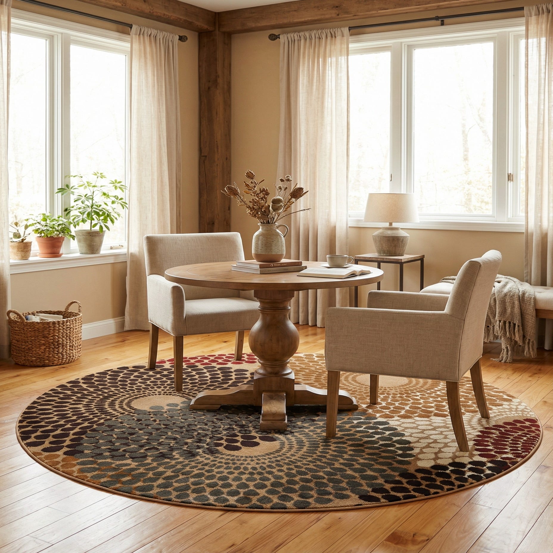 This round rug works well beneath a small breakfast table or in a cozy reading nook, anchoring a conversation area with warm wood or leather furniture. It pairs naturally with mid-century and transitional interiors, and adds depth to neutral schemes or complements richer palettes with olive, burgundy or navy accents. Use it to define an entry, home office, or casual dining spot where a compact, patterned piece can bring color and texture without overwhelming the room.