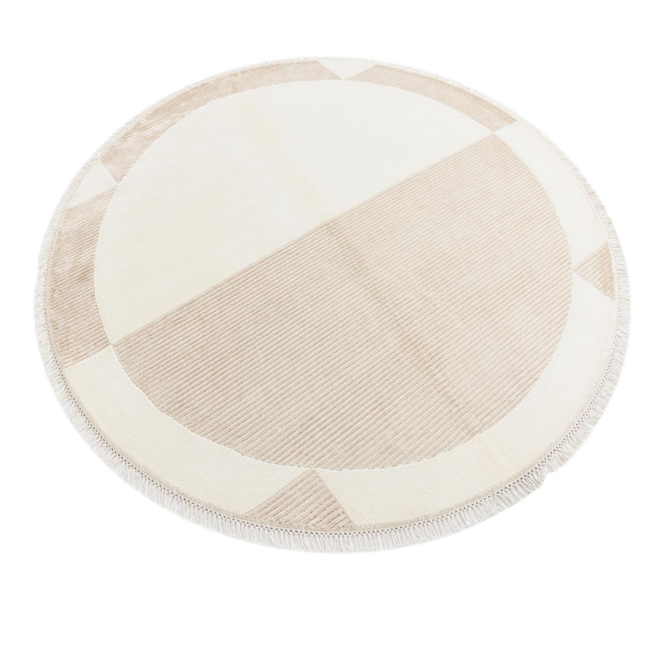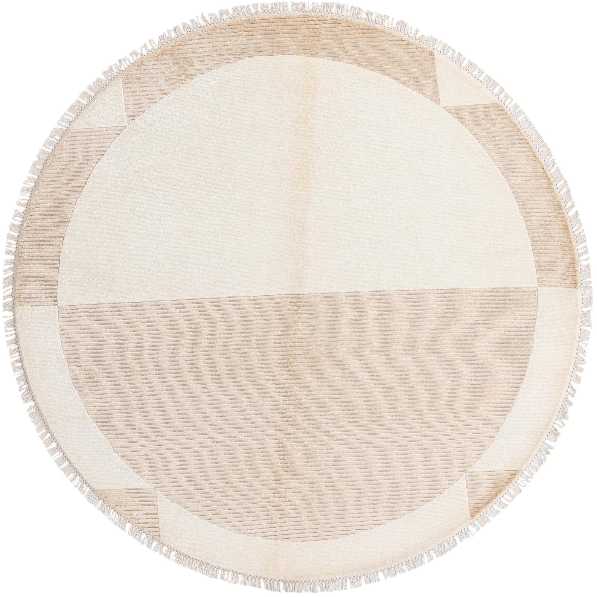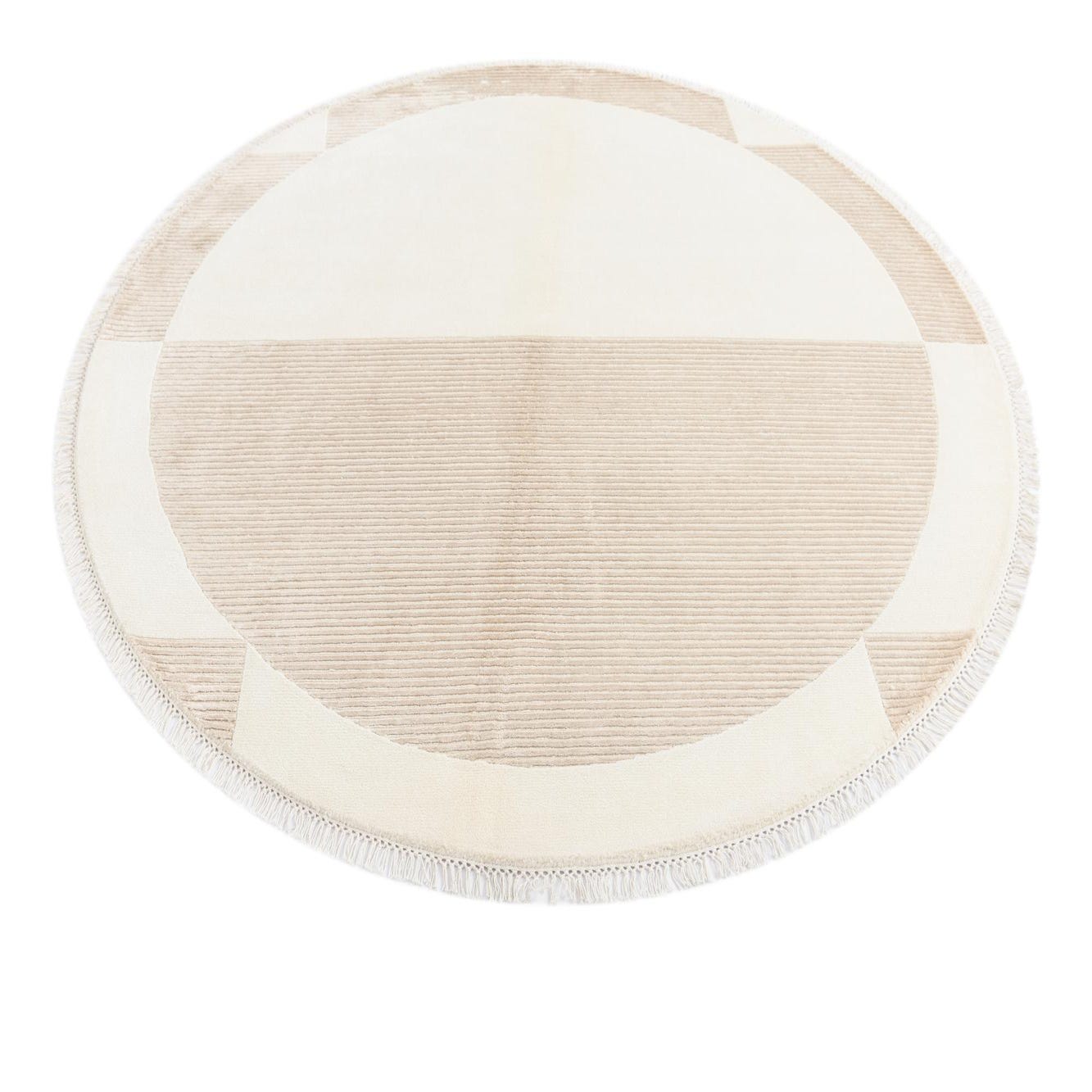 Hand?knotted in 100% wool, this round rug presents a calm, geometric composition with a warm beige field punctuated by light brown and tan accents. A large circular center contrasts with subtly ribbed quadrants and border panels, creating a gentle play of matte and textured surfaces. The wool pile feels soft and substantial underfoot, while the raised ribbing and short fringe add tactile interest you can both see and feel.