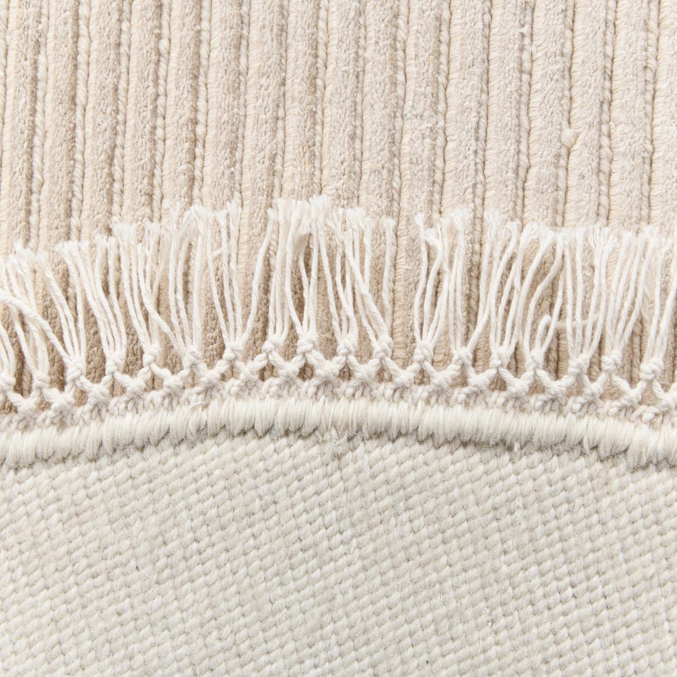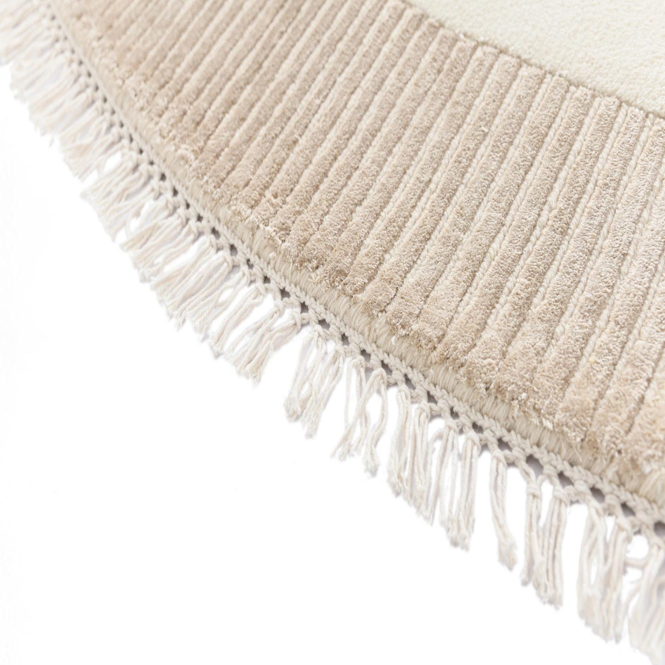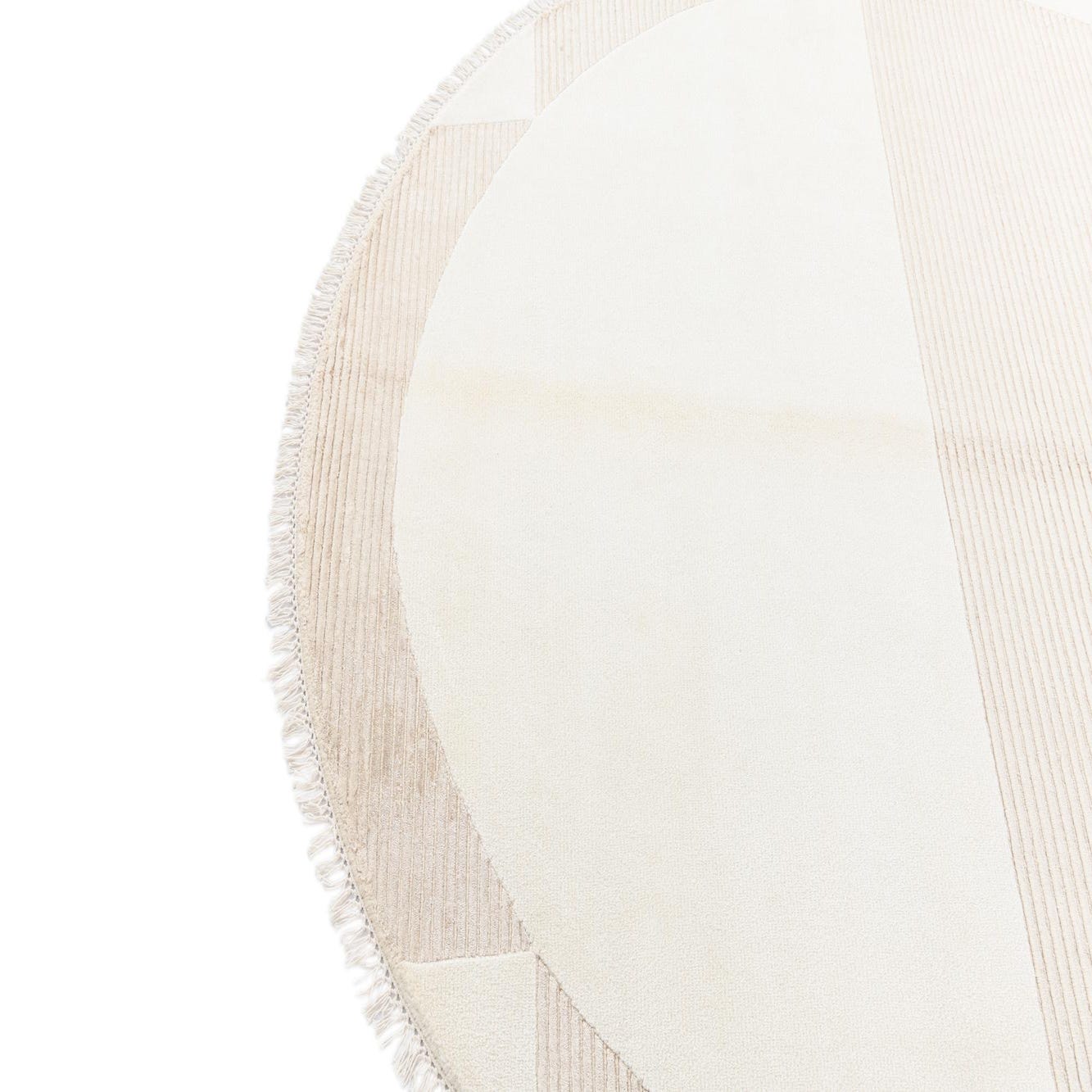 Hand?knotted in 100% wool, this round rug presents a calm, geometric composition with a warm beige field punctuated by light brown and tan accents. A large circular center contrasts with subtly ribbed quadrants and border panels, creating a gentle play of matte and textured surfaces. The wool pile feels soft and substantial underfoot, while the raised ribbing and short fringe add tactile interest you can both see and feel.