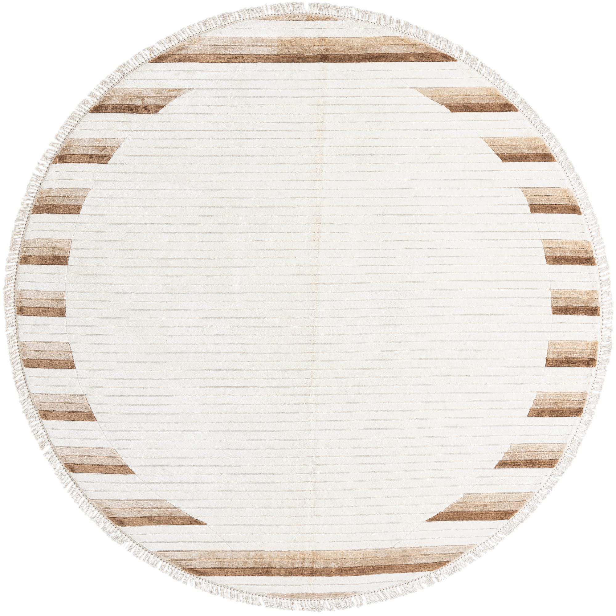 A 6' 6 round Darya rug featuring a modern oriental design with ivory and cream stripes and brown geometric accents, handmade from wool.