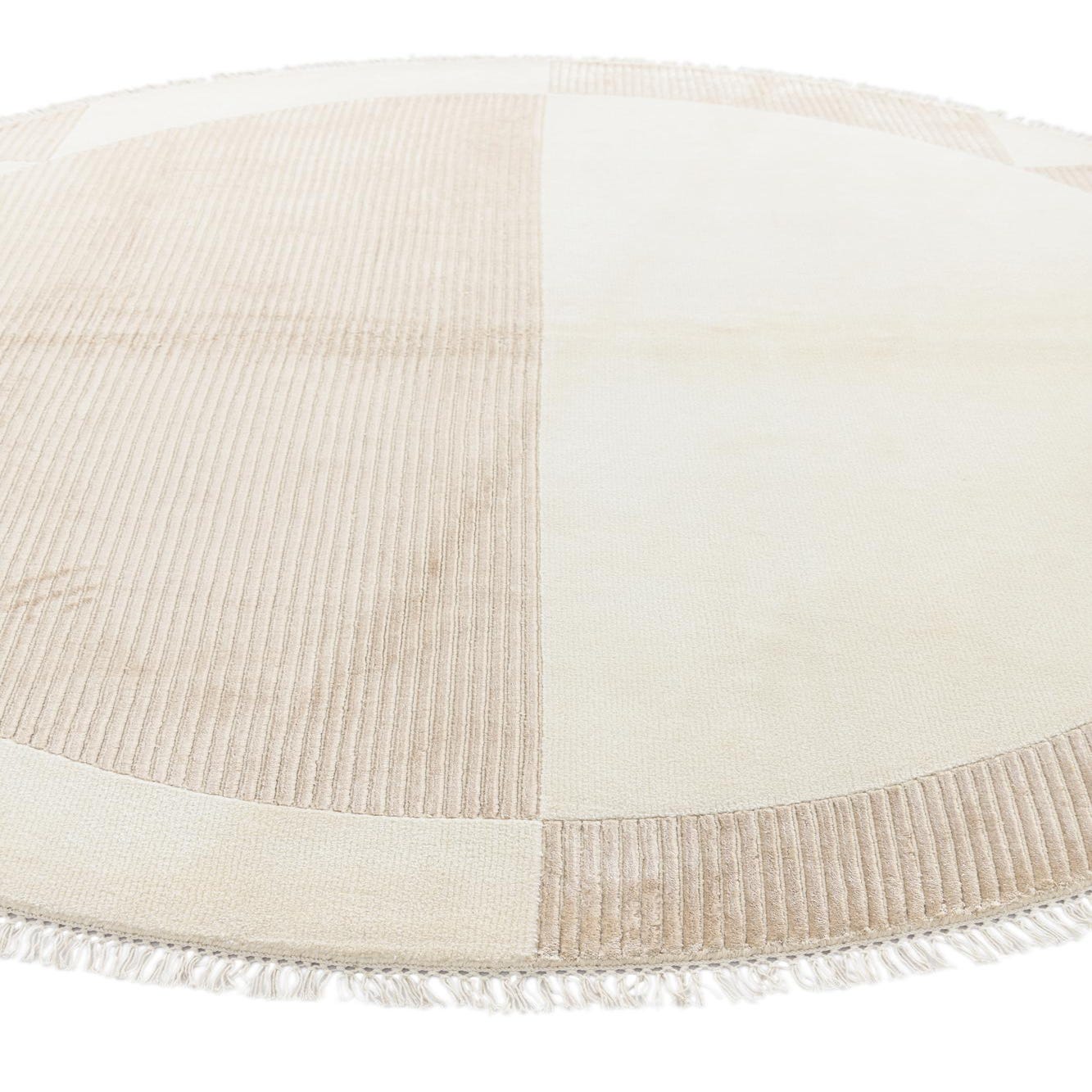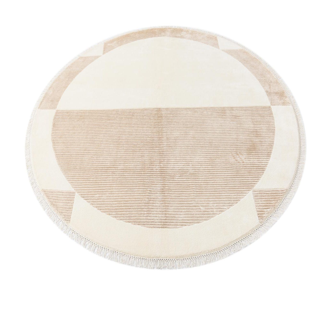 This Darya Collection rug is a hand-knotted piece crafted from 100% wool, offering a 6-foot diameter round shape to suit a variety of spaces. The rug's pattern is a minimalist interpretation of geometric design, featuring a juxtaposition of beige and light brown sections that convey a sense of balance and harmony. The background color of beige provides a neutral base, while light brown accents add a subtle touch of warmth and depth.
