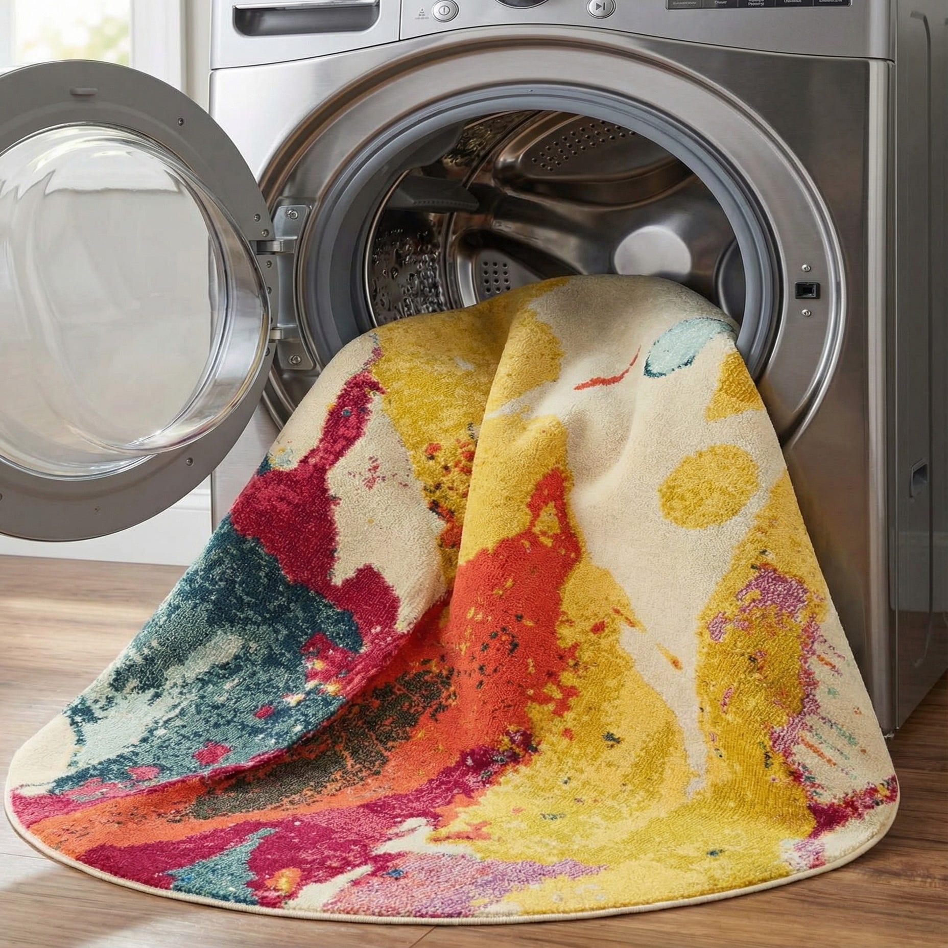 This rug suits contemporary and eclectic interiors where color is a focal point — try it beneath a round dining table, to anchor a cozy seating cluster, or as a striking entryway statement. It pairs well with warm wood tones and brass accents, a navy sofa or neutral upholstered pieces to let the hues stand out, and works with gallery-style walls or mid-century modern furnishings for a lively, curated look.